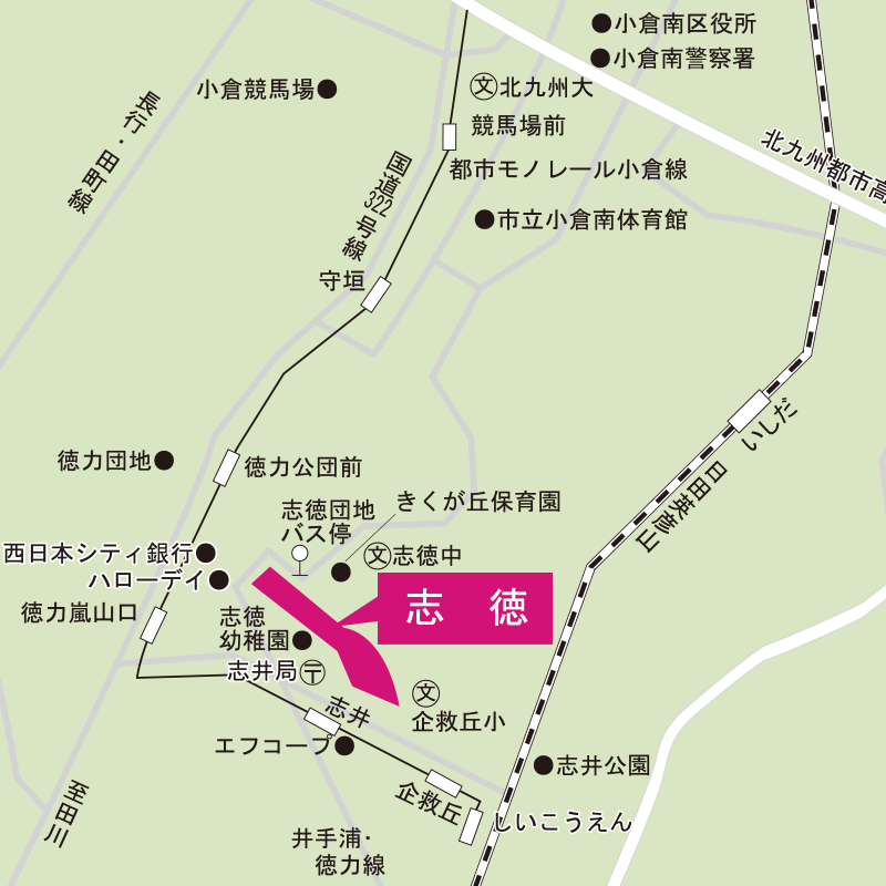 最寄り駅は、北九州都市モノレール小倉線「徳力公団前駅」と「志井駅」です。徳力公団前駅から団地まで約13分、志井駅からは徒歩約8分。各駅の近くにはスーパーマーケットがあります。特に徳力公団前駅から団地へ向かう道のりには、銀行や郵便局のほか、飲食店を中心にさまざまな商店が構えられ、団地と隣接して内科や小児科など多数のクリニックが建ち並んでいて便利。総合病院へのバス便のアクセスも良好です。