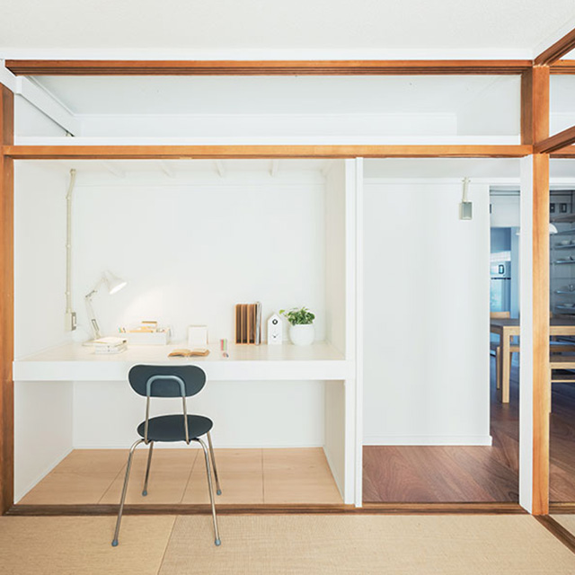 「押入のワークスペースがある暮らし」をコンセプトとするお部屋は、リビングとダイニングキッチンの間にある押入れを改装したワークスペースが特長で、両側のふすまを開ければ開放的な空間で仕事をすることができます。