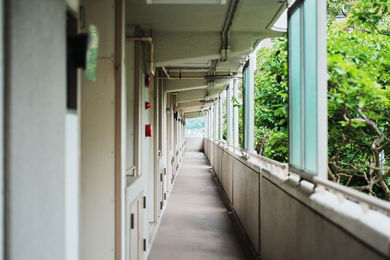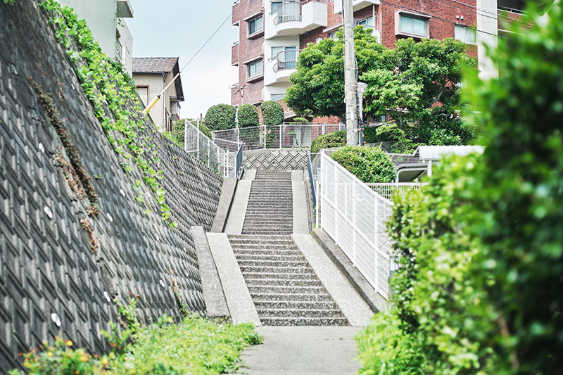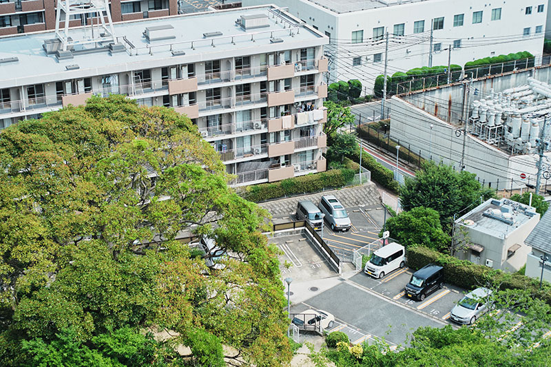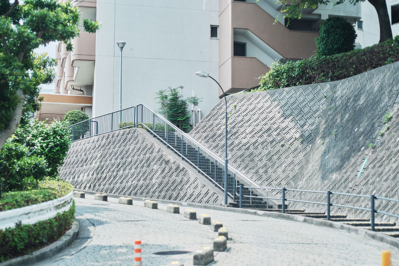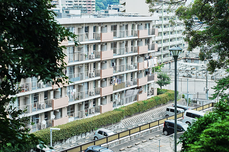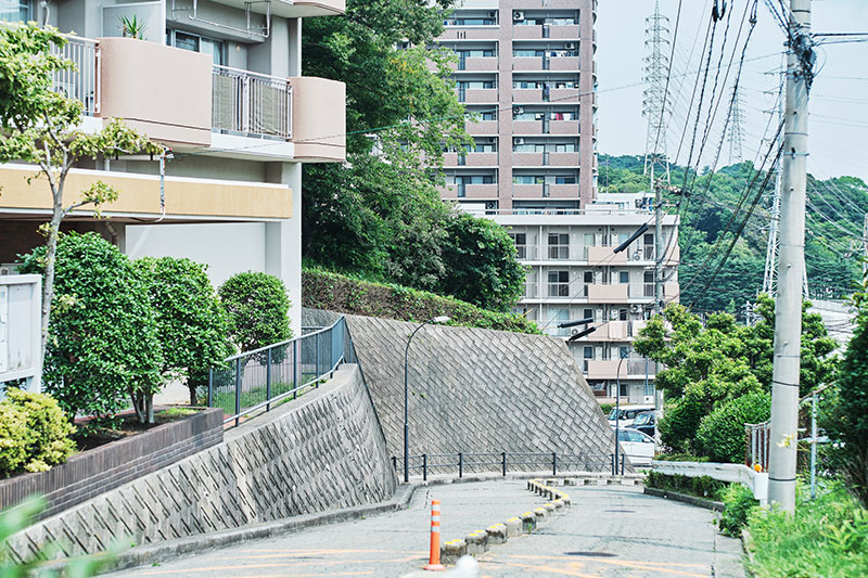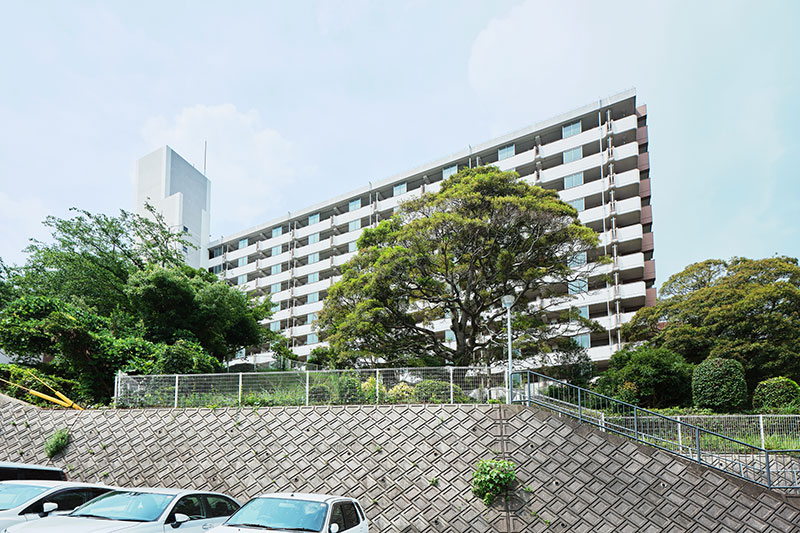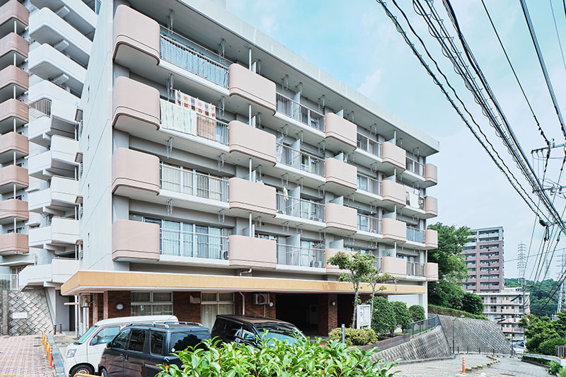 団地の管理が始まったのは昭和59年。12階建の1号棟と5階建の2号棟、同じく5階建の18号棟の3棟、総戸数185戸で構成されています。丘の中腹に建っていますが、団地横の公道を利用すれば、アップダウンのきつさは、体感的にはずいぶん軽減される印象です。