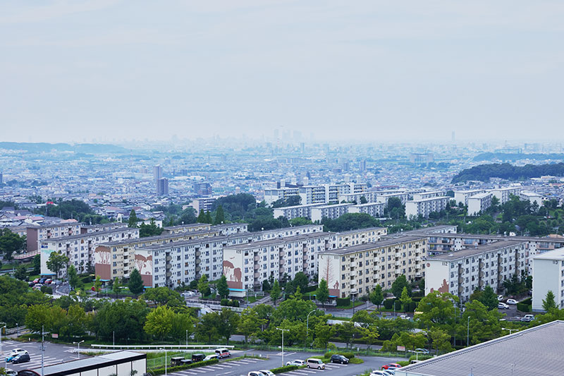 中央台団地にある高層棟からは、団地の先に広がる穏やかな里山や、名古屋の市街地の高層ビル群を一望できます。丘陵地に作られた街ならではの景観の良さと言えるでしょう。