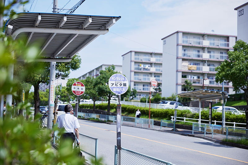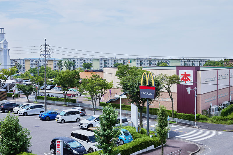 バスに乗って約8分で到着する「中央台」バス停の目の前には、「アピタ高蔵寺店」「サンマルシェ」などのショッピングモールが。買い物客で賑わう施設の道向かいに、「中央台団地」が広がります。