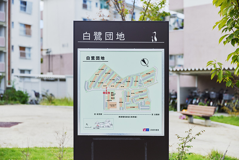 団地の名称は、田園が広がっていた時代、白鷺が群れをなしていたことが由来です。今も、住棟や案内板には、白鷺をモチーフにしたイラストが描かれ、往時をしのばせます。