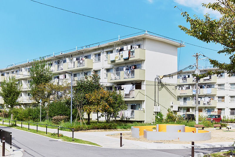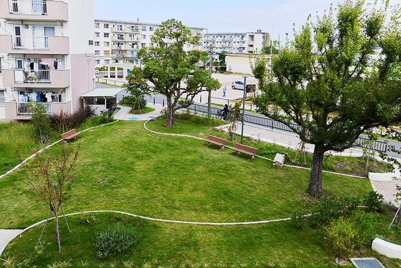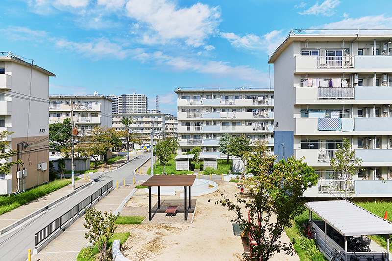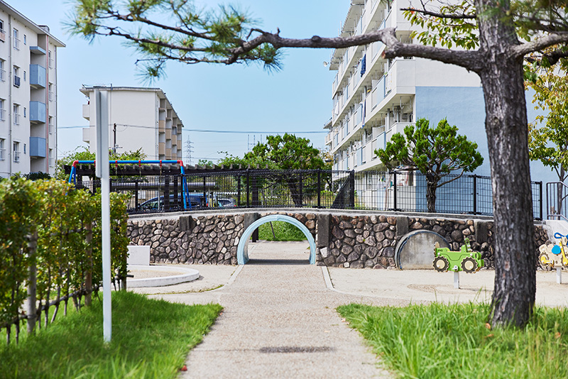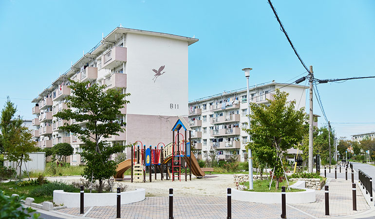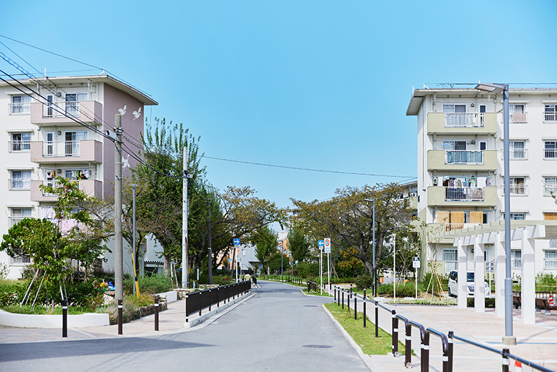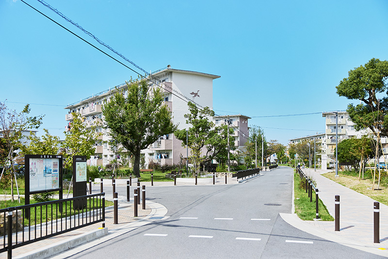 南海電鉄高野線の「白鷺駅」から線路に沿って歩くと、ほどなく「白鷺団地」が見えてきます。その敷地に入ると、車道と分離されたタイル敷の歩道が伸びています。ゆったりとした間隔で、住棟が配置された中をさらに進むと、要所には手すりが設けられており、ご年配の方などにとっても、安心して移動できる環境になっていることに気づきます。