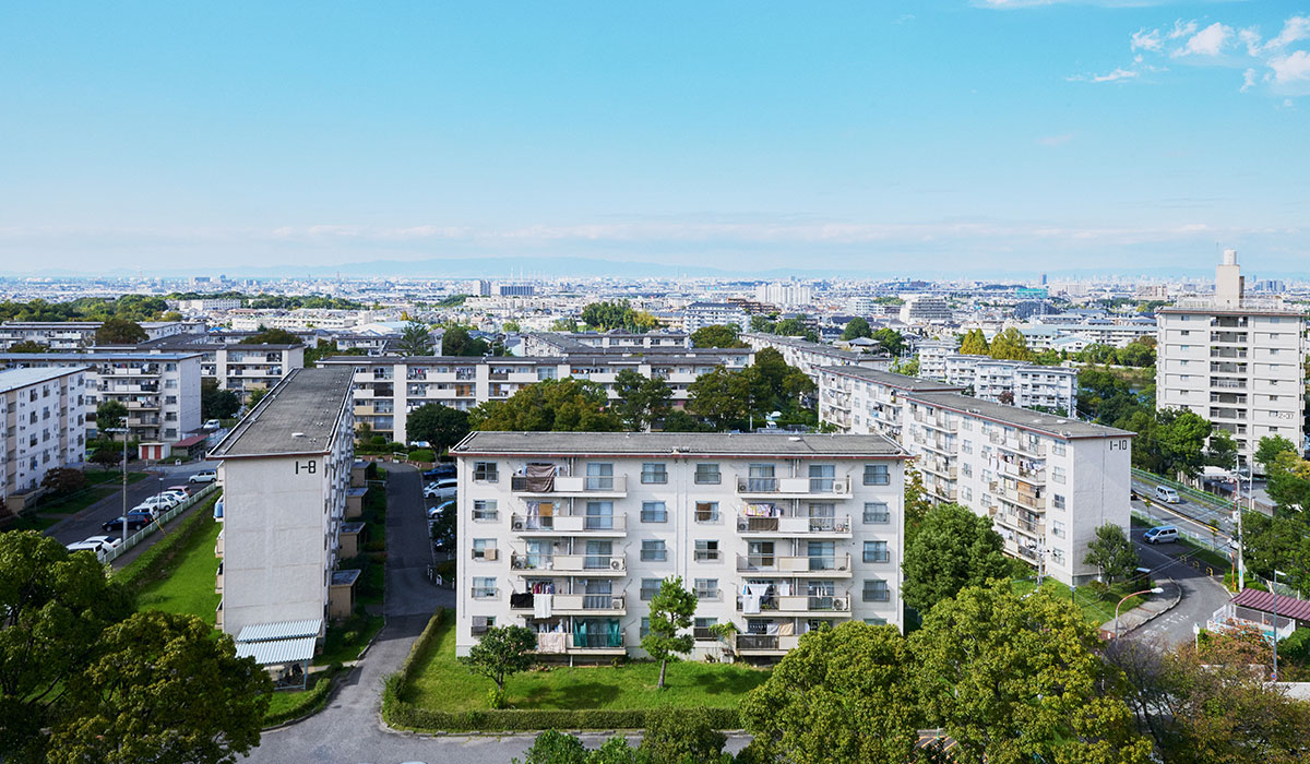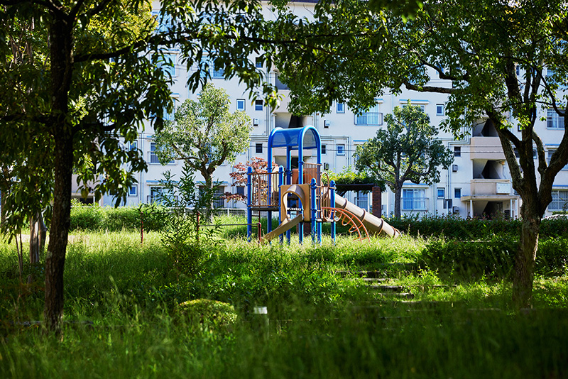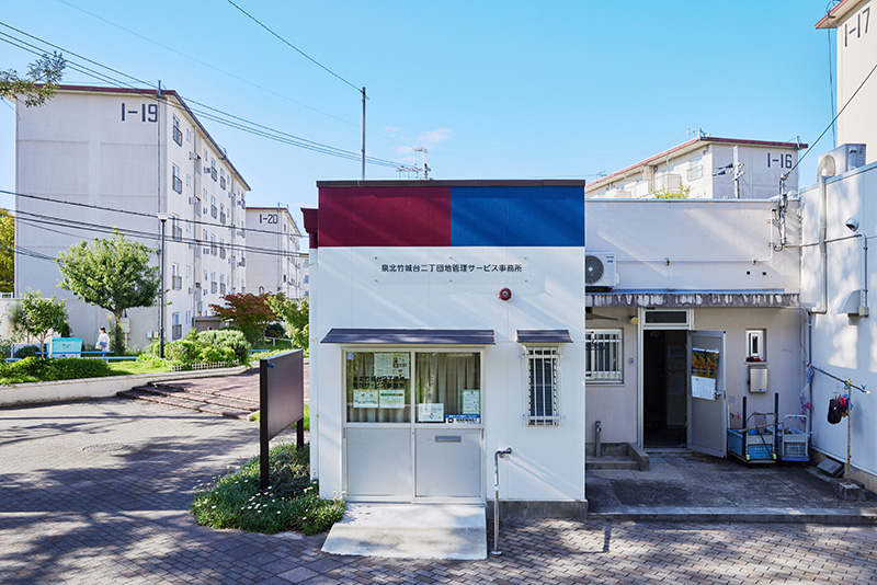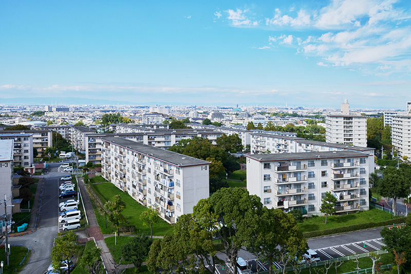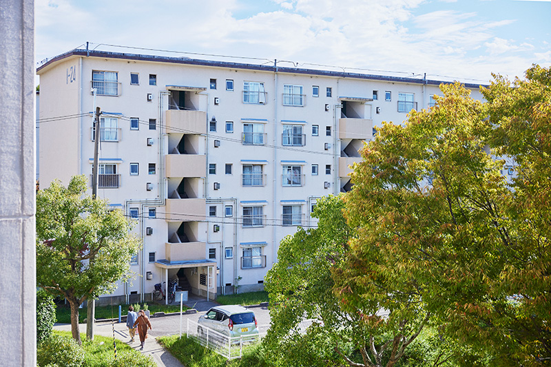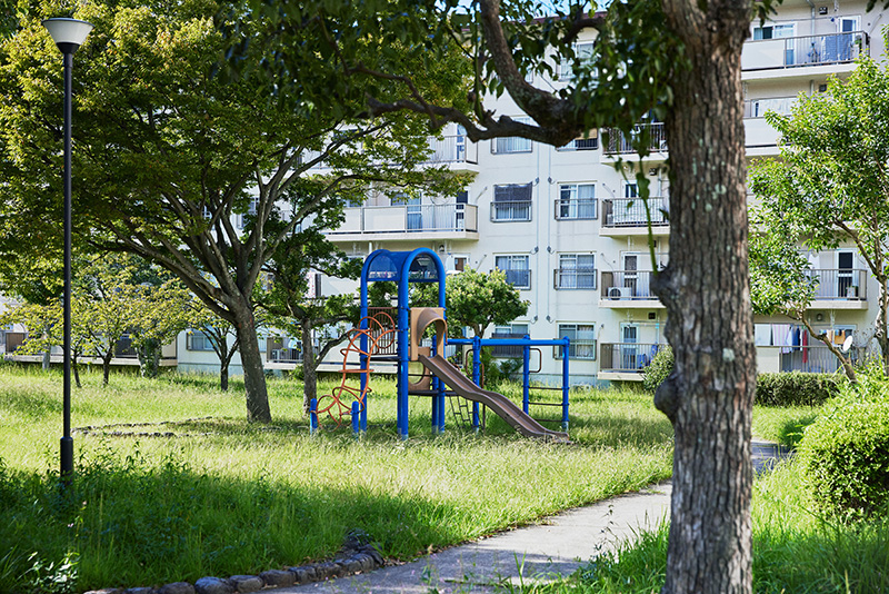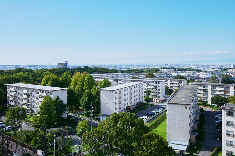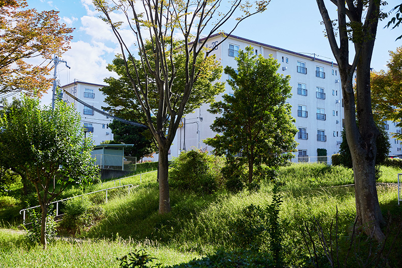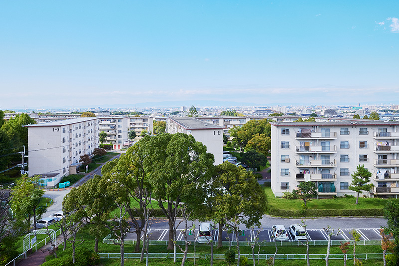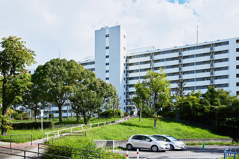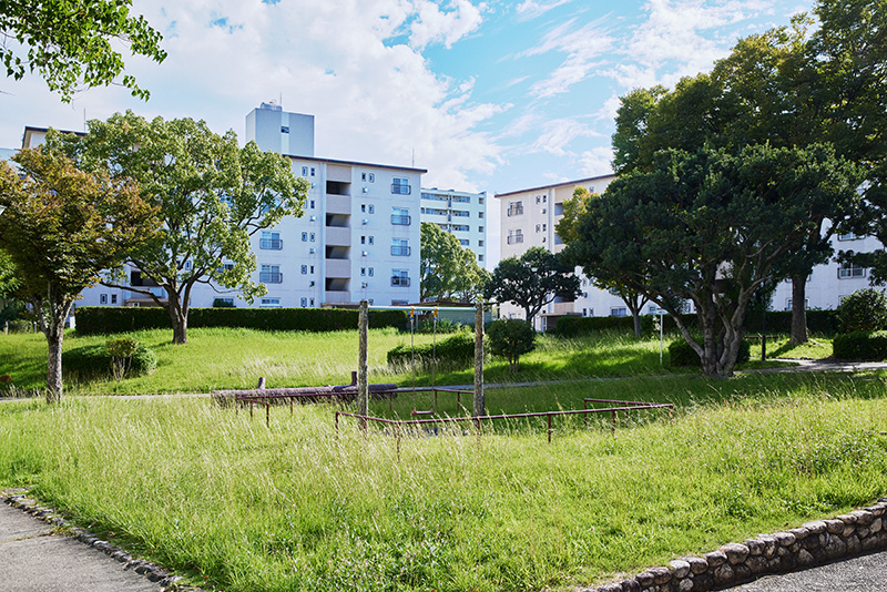 「泉北竹城台二丁団地」は、1972(昭和47)年に管理が開始された、全28棟915戸の団地。昭和30年代から40年代にかけて大阪府内に誕生した2つのニュータウンのうちのひとつ「泉北ニュータウン」開発時に建設されました。団地には、住棟がゆとりを持った間隔で並び、それらに囲まれる形で、プレイロット(小公園)や芝生、ひと息つけるベンチなどが設けられています。敷地内の道は段差が少ないところが特徴。ベビーカーやシニアカーを利用する方もスムーズに移動できる、という声も多いだけあって、穏やかな雰囲気の中、散歩を楽しむ方もいます。
