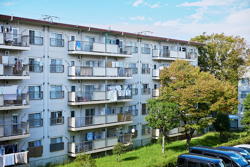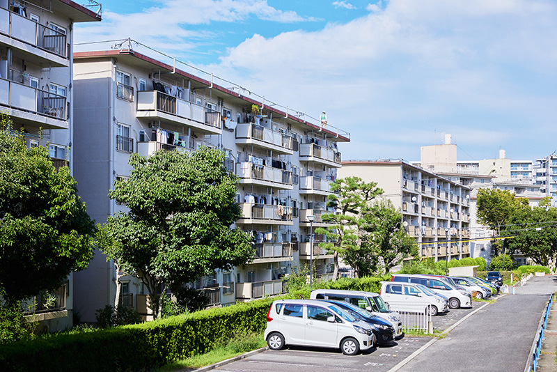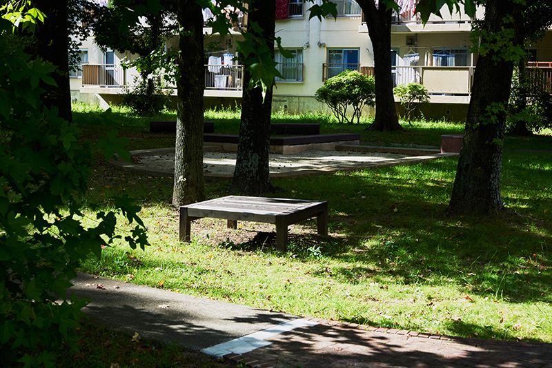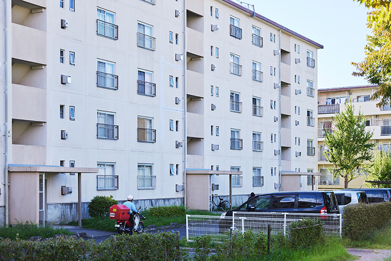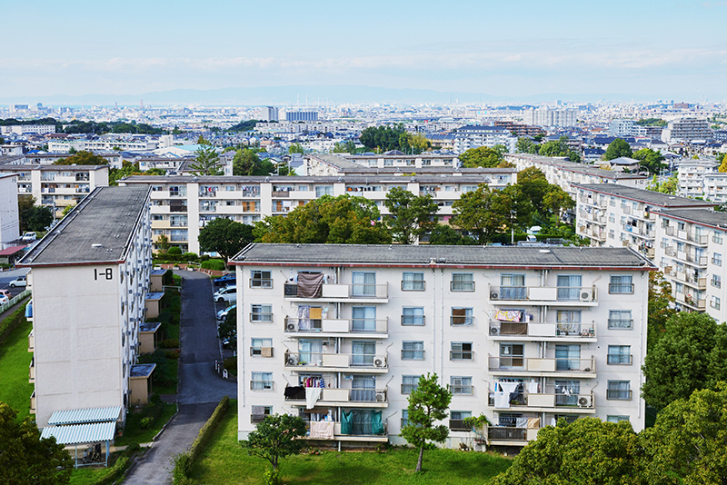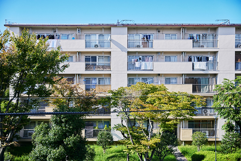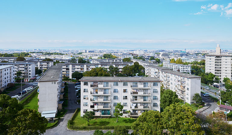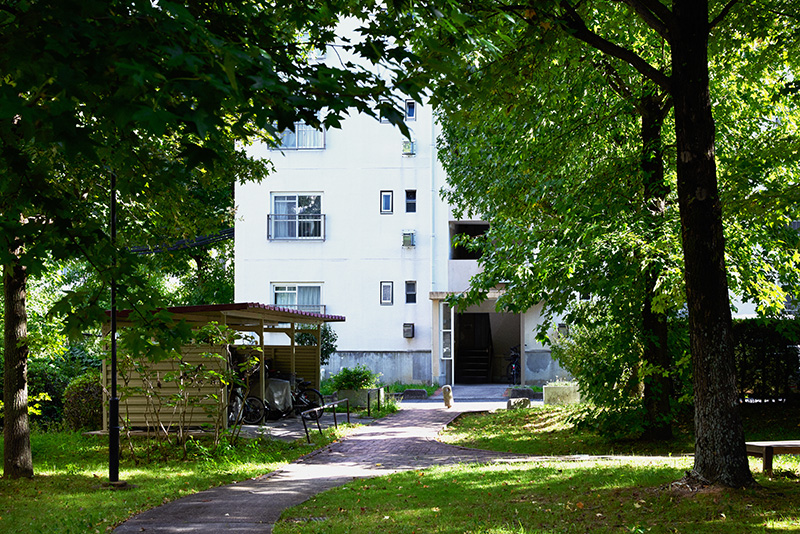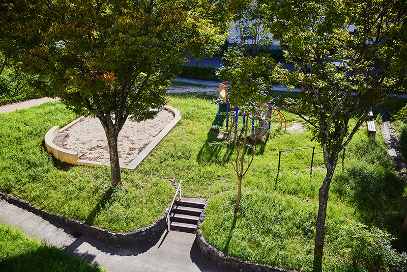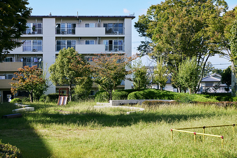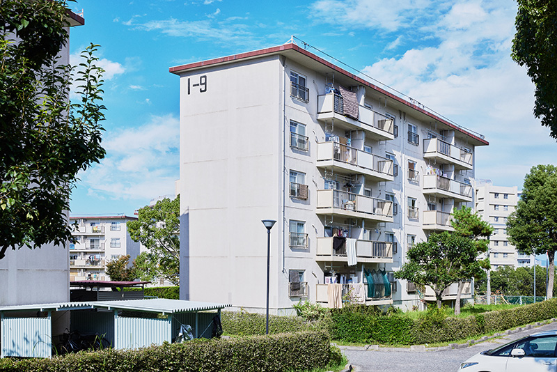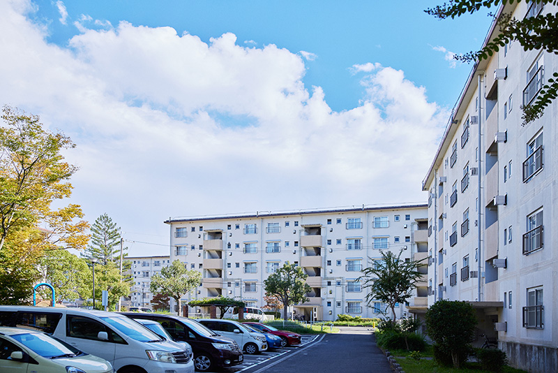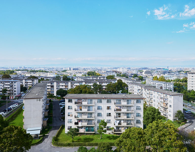 「泉北竹城台二丁団地」は、1972(昭和47)年に管理が開始された、全28棟915戸の団地。昭和30年代から40年代にかけて大阪府内に誕生した2つのニュータウンのうちのひとつ「泉北ニュータウン」開発時に建設されました。団地には、住棟がゆとりを持った間隔で並び、それらに囲まれる形で、プレイロット(小公園)や芝生、ひと息つけるベンチなどが設けられています。敷地内の道は段差が少ないところが特徴。ベビーカーやシニアカーを利用する方もスムーズに移動できる、という声も多いだけあって、穏やかな雰囲気の中、散歩を楽しむ方もいます。