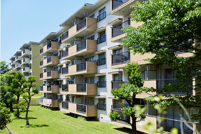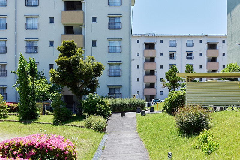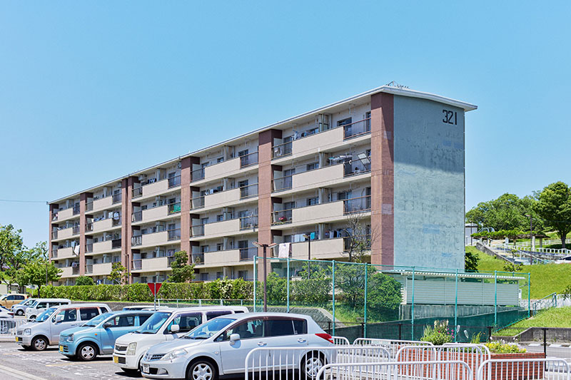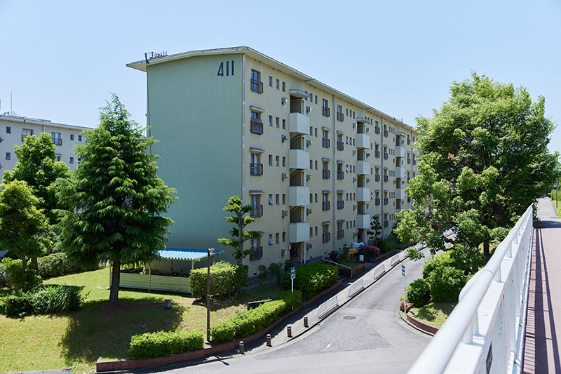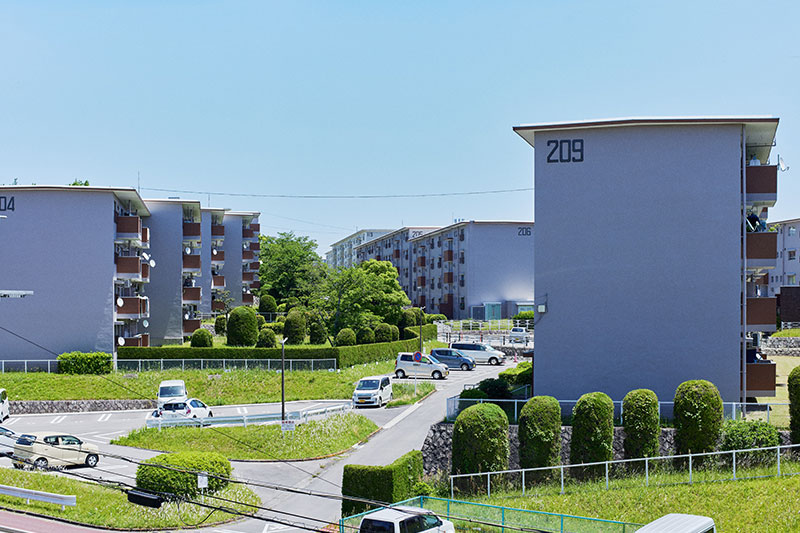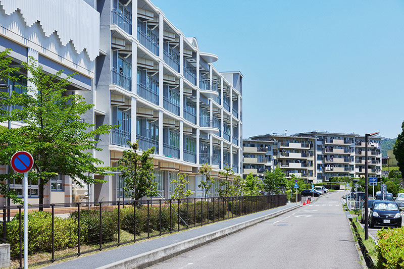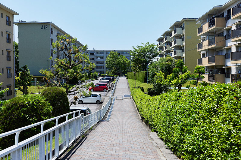 高蔵寺ニュータウンとして最初にできたところで、十分な間隔をあけられた住棟が並び、豊かな緑に彩られた広々としたスペースの中を縫うように、歩行者専用道路が設けられています。
