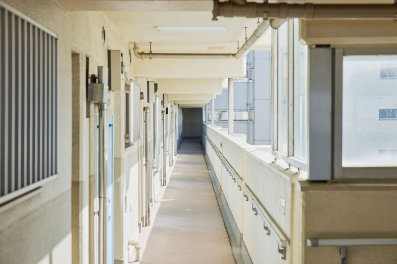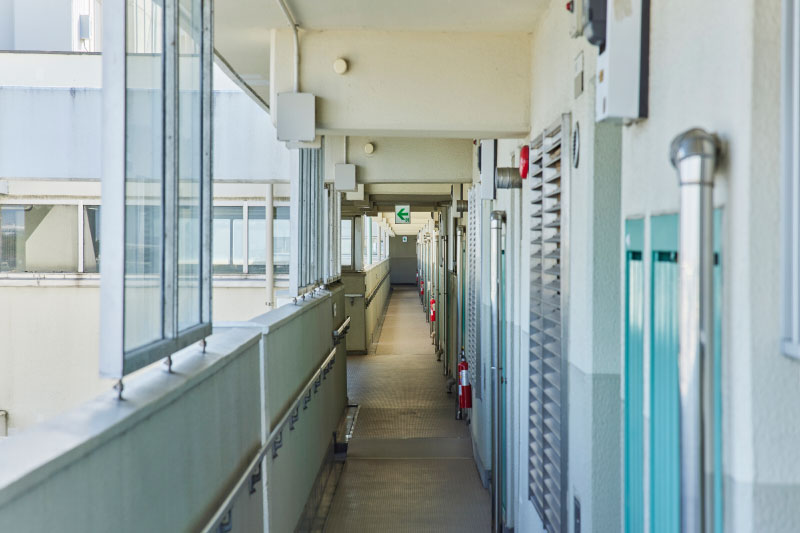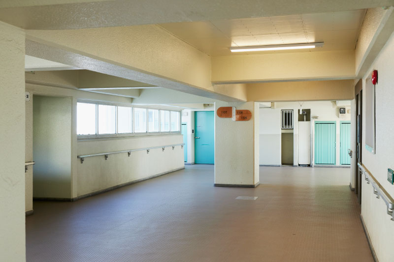 ゆとりある敷地内に立つ住棟は、日当たり、風通しともに良好。エントランスやエレベーターホールなどの共用スペースも余裕のあるレイアウトで、敷地内には開放感のある中に落ち着いた空気が流れています。