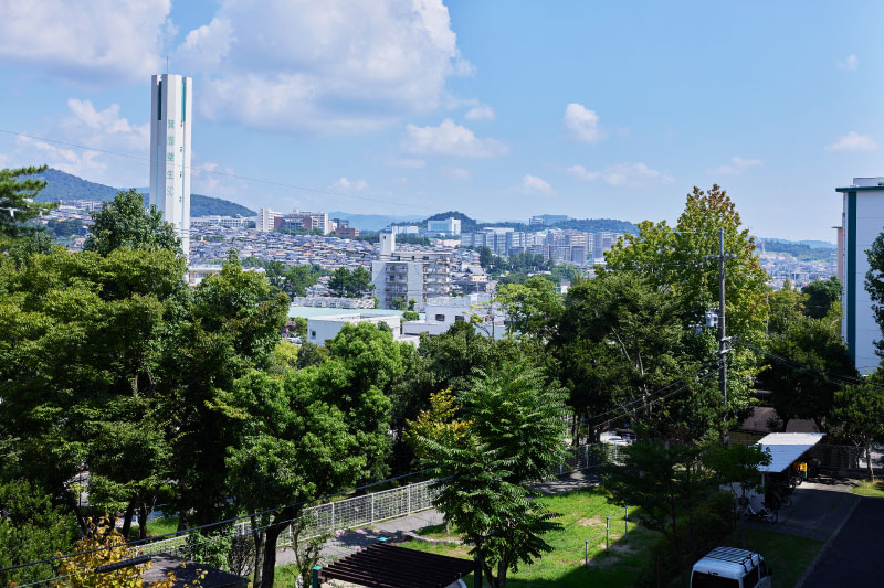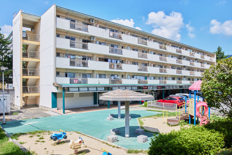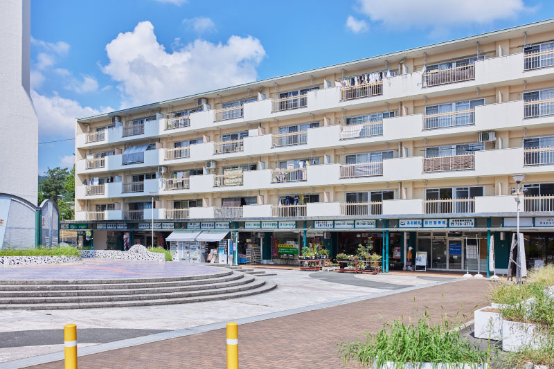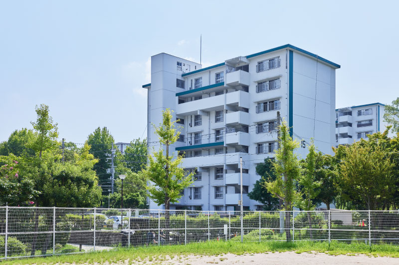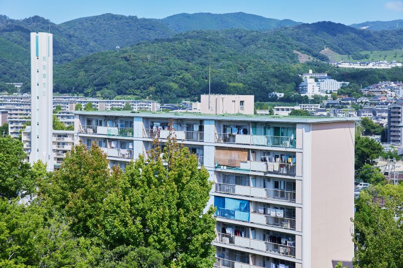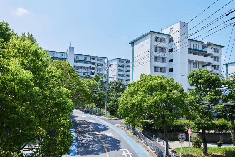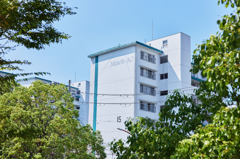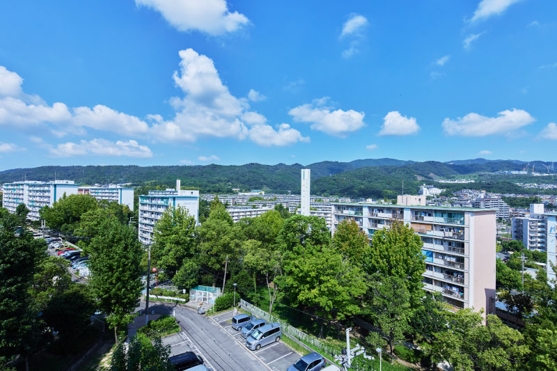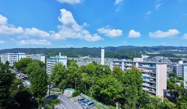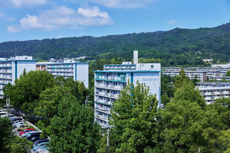 大阪府箕面市にある「箕面粟生第3団地」は1975(昭和50)年から管理が開始された団地です。緑豊かな丘陵地に十分な間隔を空けて並ぶ住棟は、日当たりも風通しも良好。高層階からは箕面の山々を望む眺望も楽しめます。