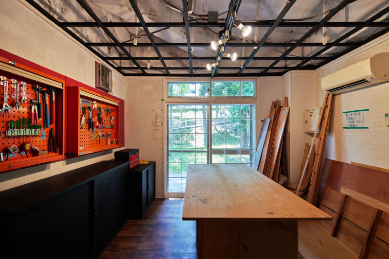 もうひとつは集会所の中にある「DIY-COBO」。団地に住む人が利用できる、DIYを楽しむための設備を整えた工房です。お子さまの成長などライフスタイルの変化に合わせて、自分たちで家具などを製作することができます。