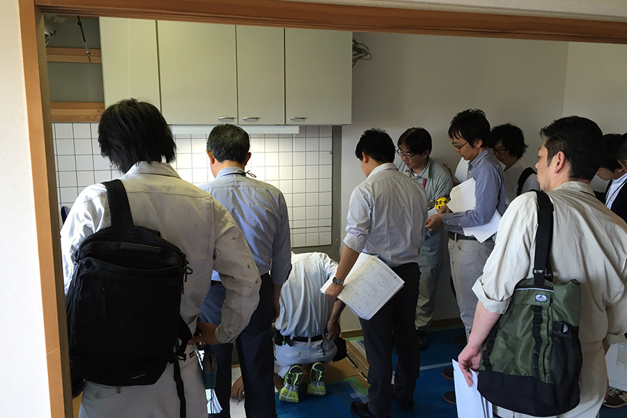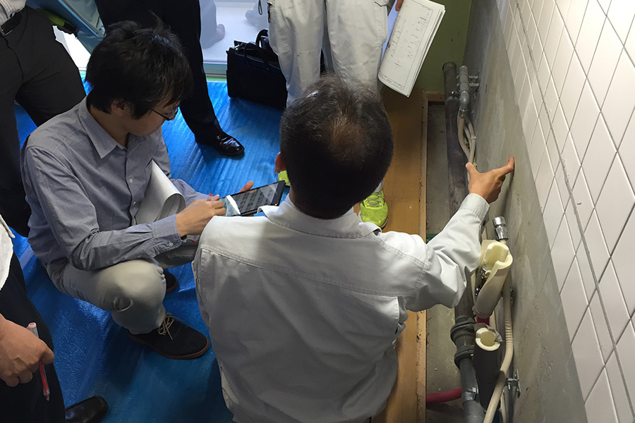 部屋に入ると、既にミーティングの真っ最中。今日はリノベーションされる箇所、主に設備関係を撤去したうえでの打ち合わせです。