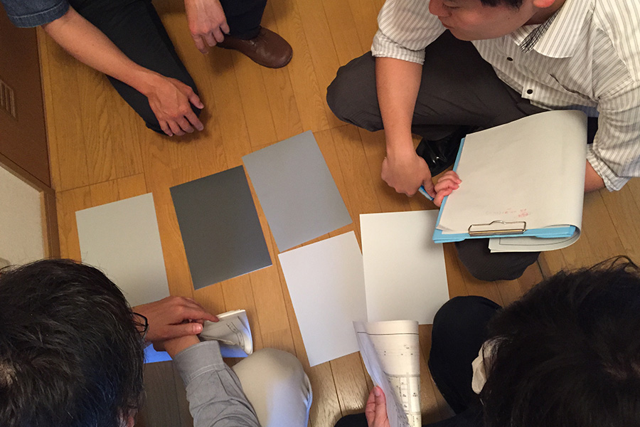続いて壁の色を検討中の様子。ずらっと並んだ色見本を囲んでどれが良いか・・