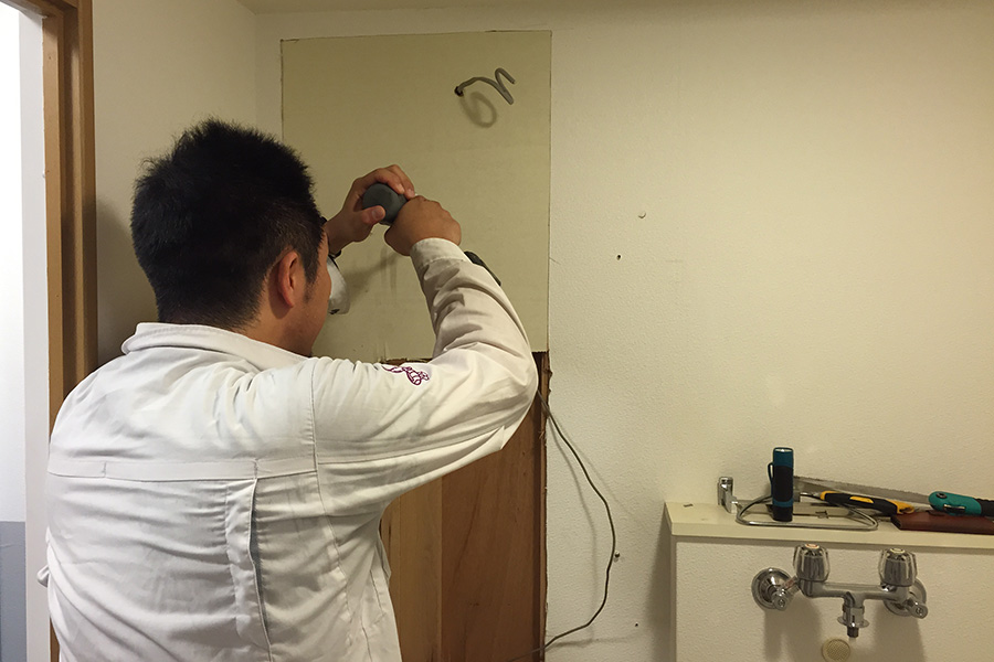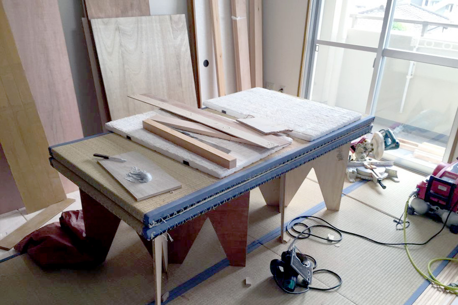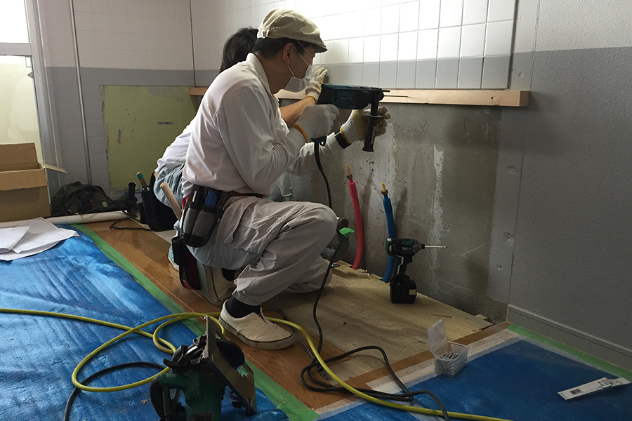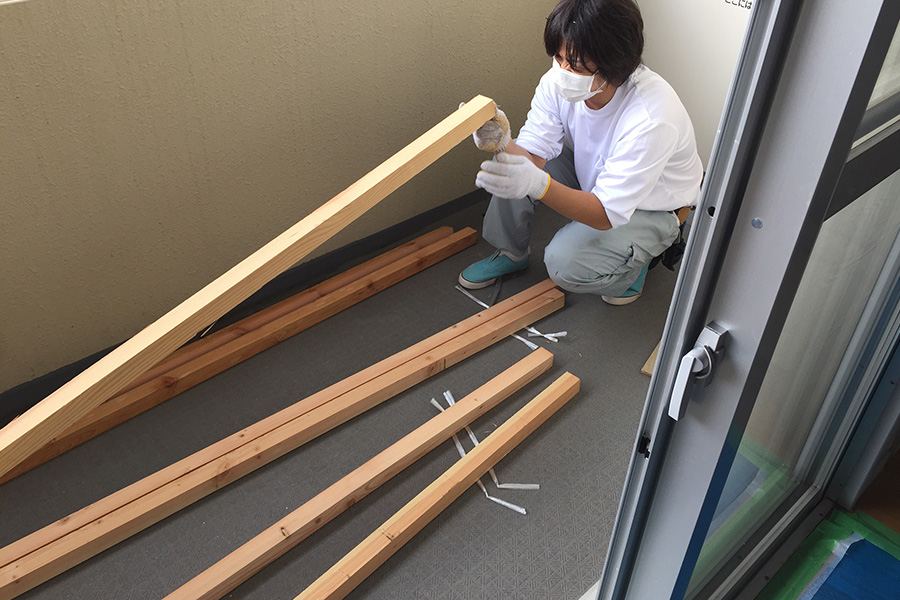 そして、アルビス五月ヶ丘団地内のMUJI×URの現場に到着すると、大工さんの作業が開始されておりました。