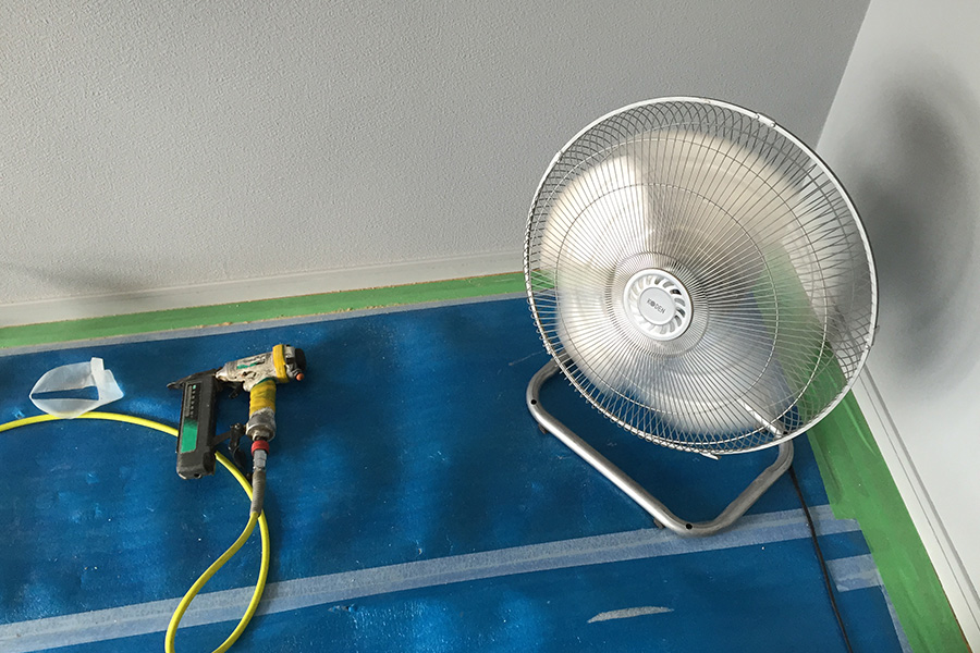 当然工事中の部屋にはエアコンはないので、大工さんの熱気で気温は上昇、大型扇風機は必需品。真夏の作業は大変です。