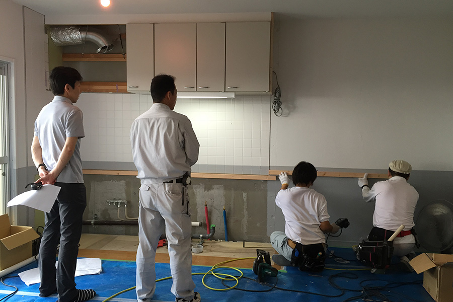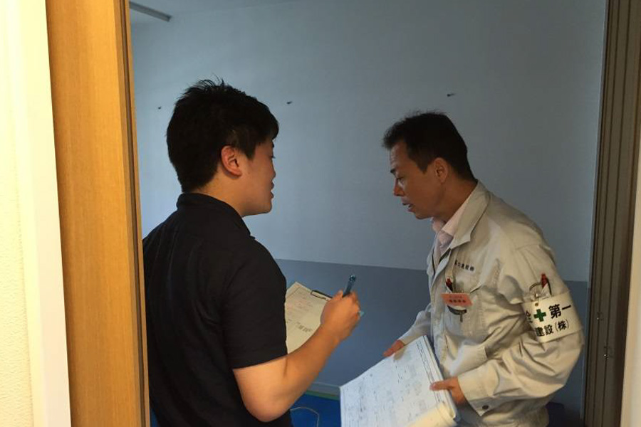 UR 担当者平川(左)と打ち合わせしているのは、現場監督の福岡さん。今後のキッチンと洗面台の搬入日程を最終確認しています。どちらもMUJI×UR 団地リノベーションプロジェクトから新たに生まれたリノベーションパーツです。