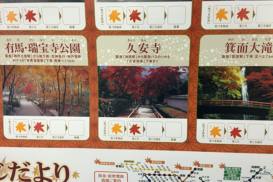毎年この季節になると、阪急電車の駅には「もみじだより」が張り出されます。これで各所の色づき具合が一目瞭然。眺めているだけでも行った気分になれるので、私はよく通勤途中に立ち止まって見ています。池田にも久安寺という紅葉の名所がありますよー!