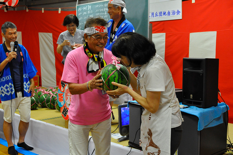 - 夏まつりですね、団地の集会所を中心にたくさんの人が集まります。とくに名物になっているのがスイカ100個の抽選会で毎年大盛り上がりですよ。あと、近所の中学校の生徒さんたちが祭りの飾り付けを手伝ってくれるのですが、そのお礼に自治会からカレーをふるまうんです。そうやって地域の交流を深めています。