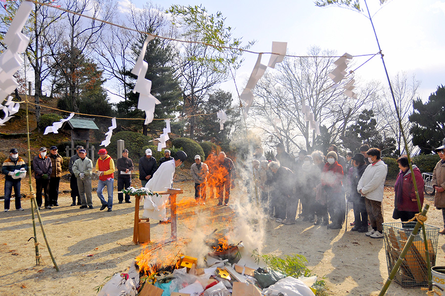 年明け小正月のとんど焼き、近くの神社から神主さんを招いて