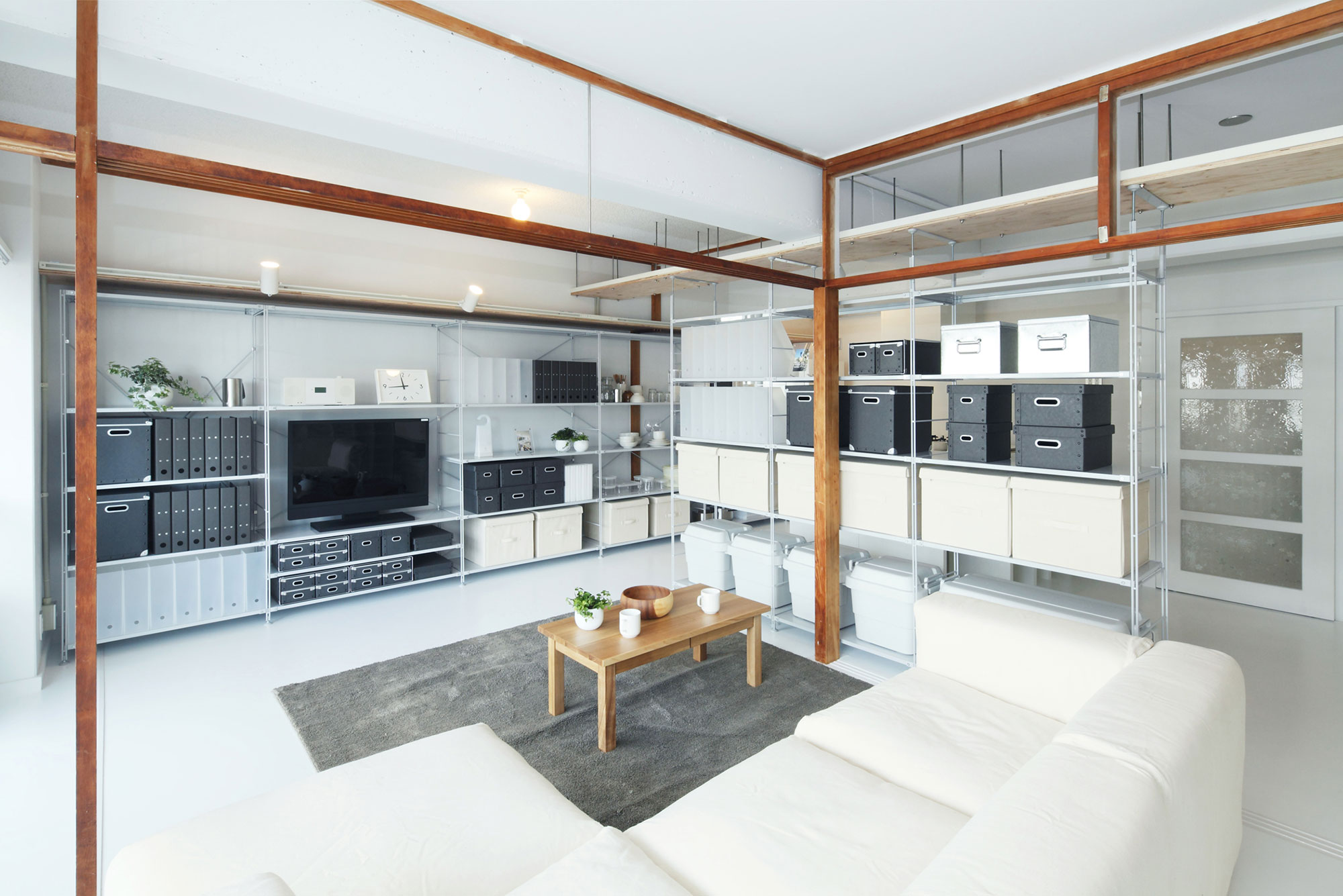 ふすまや不要な壁を撤去し、広い一室空間とすることで、住みながら間取りを自由に編集できるような新たな住まいとしました。既存の間取りに自分のライフスタイルを当てはめるのではなく、自分のライフスタイルに合せて間取りを編集できる暮らしが出来ます。
