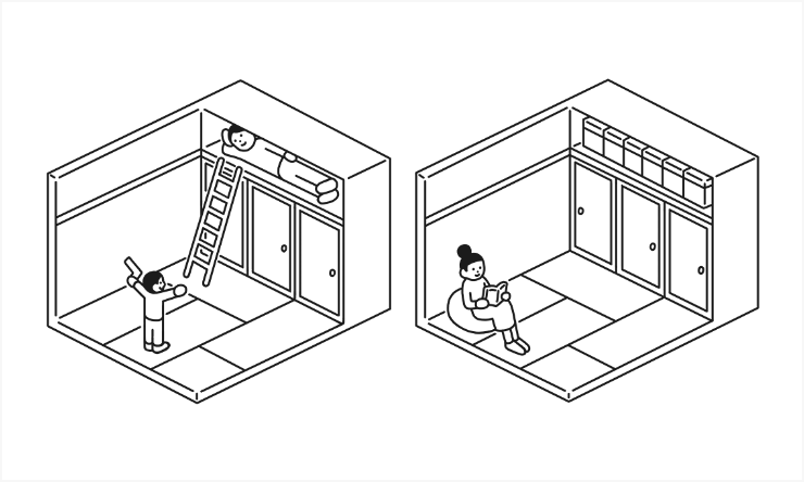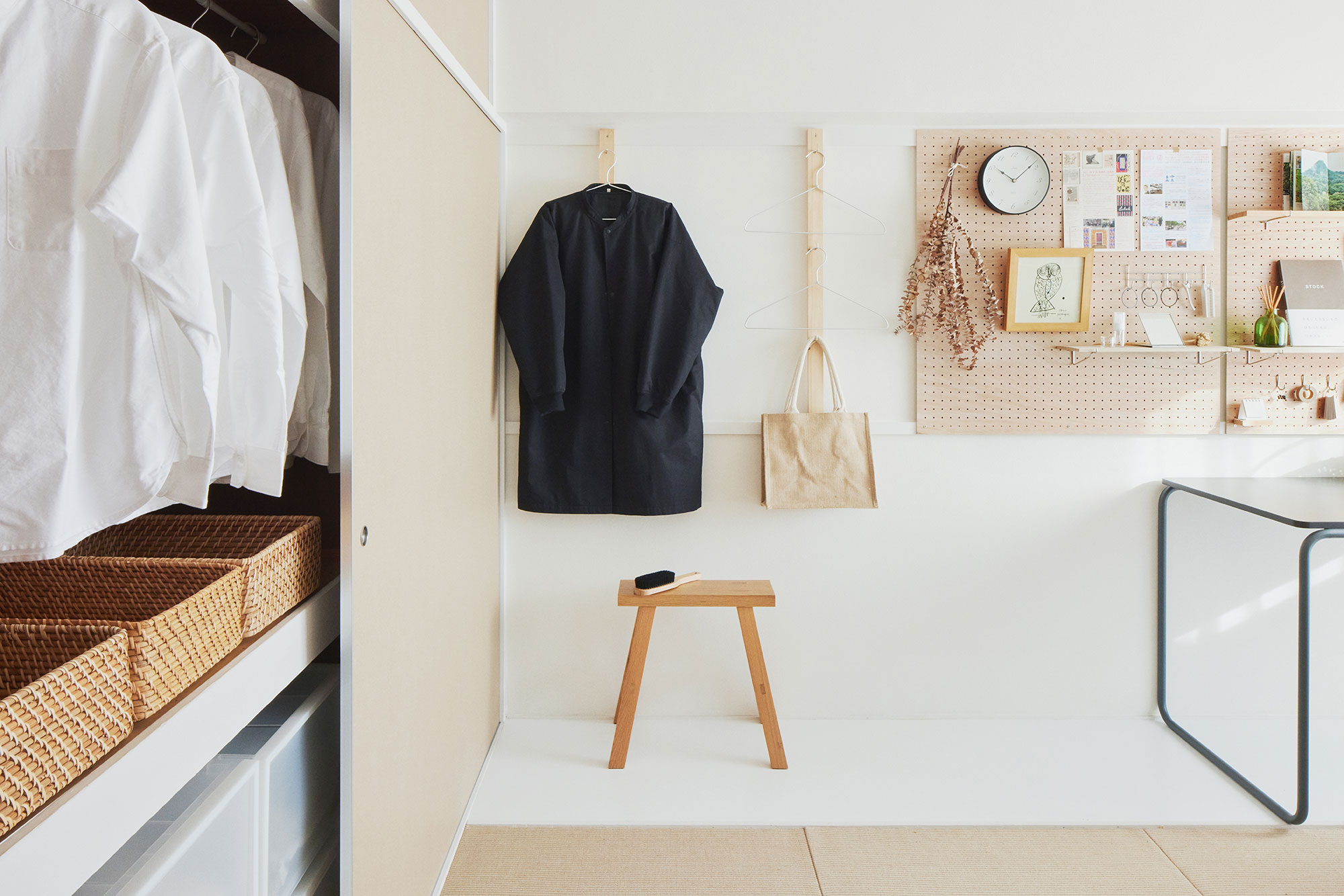 団地の間取りをあらためて見直してみると、各部屋に押入が充実していることがわかります。押入は布団が入ることはもちろん、その奥行きを生かして上手に収納することでキャンプ用品など趣味のモノを収納したり、中棚を利用してテレワークのワークデスクにするなど、自分なりの暮らしに編集することができます。そんな現代の暮らしに合った押入をそのまま残しています。また、木製の長押をリビングや玄関の壁面に加えました。長押を上手に利用することで、自分なりに壁を収納にしたり飾ったりすることができます。収納を充実させることで、余計なものを出さない簡潔な暮らしができそうです。