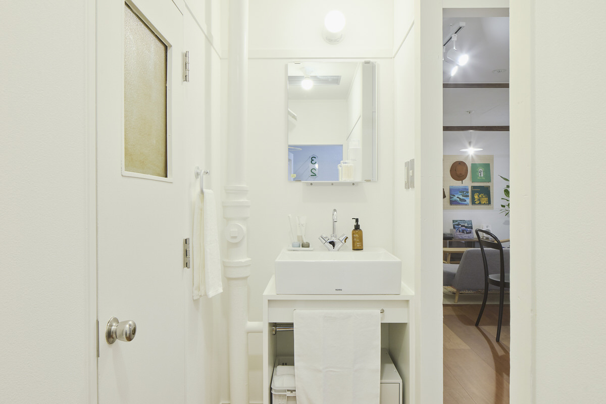 住居内の鴨居や柱、洗面所の配管、玄関ドア、表札は、実際に団地で使用されていたものを移設しました。