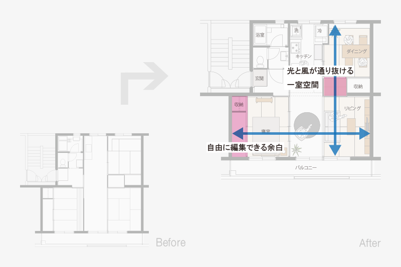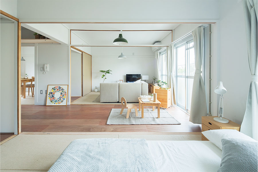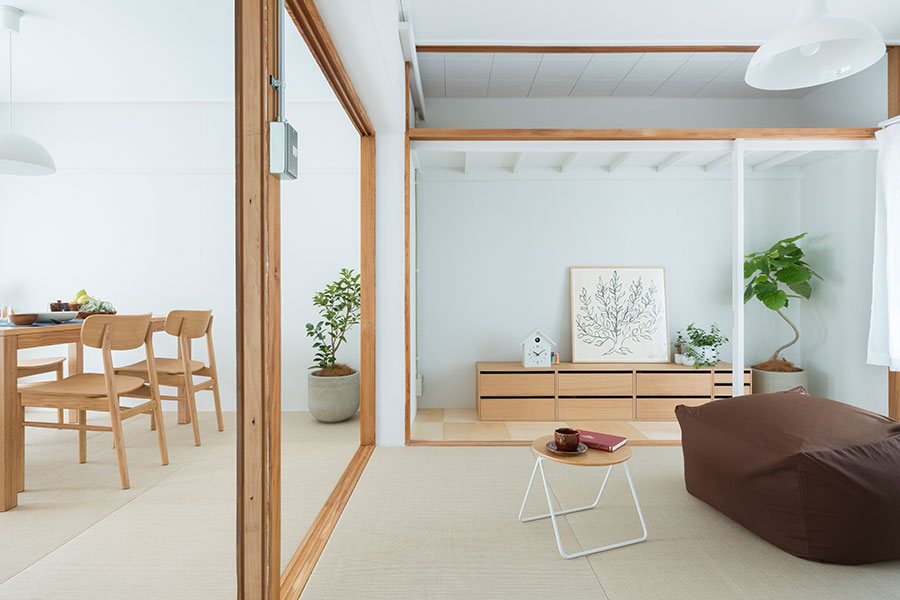 ふすまや壁を撤去し、広い一室空間とすることで、住む人が間取を自由に編集できます。またどこにいても光と風が通り抜ける空間としました。