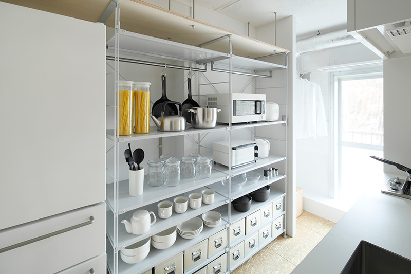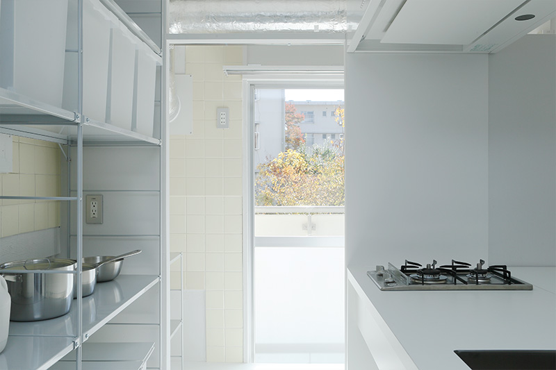 明るい光が届くキッチンとひとつながりになったユーティリティ。