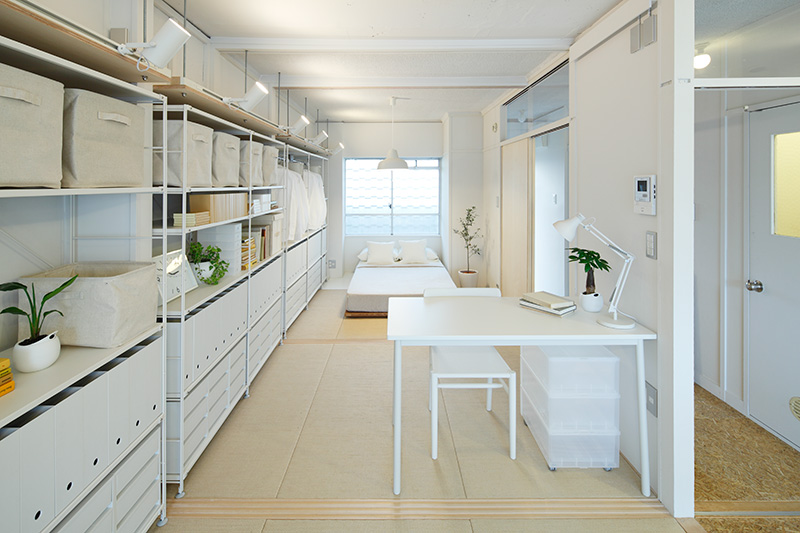 間仕切りは軽量な強化ダンボールなので、移動は簡単。仕切り方次第で、広々としたLDKにすることも、書斎のある大きな寝室にすることもできます。
