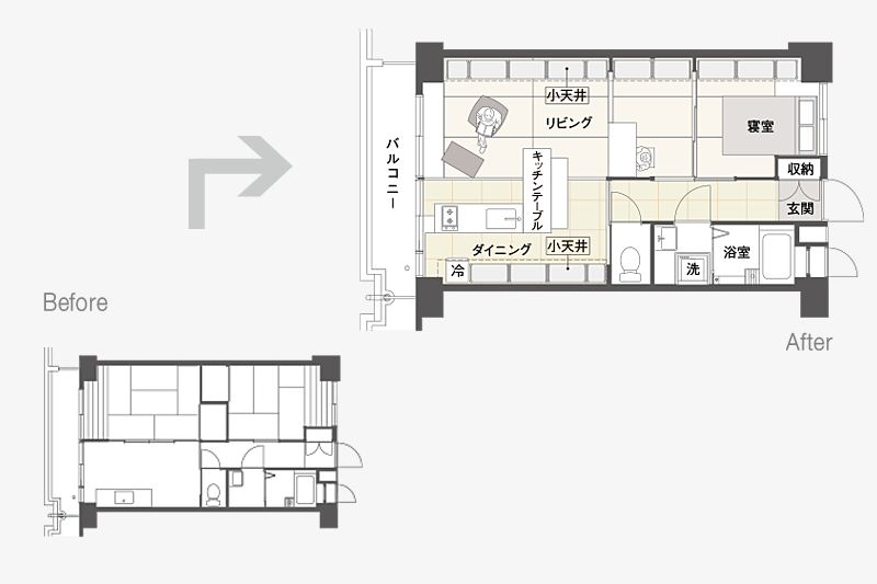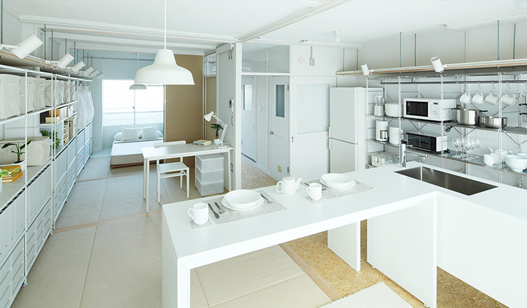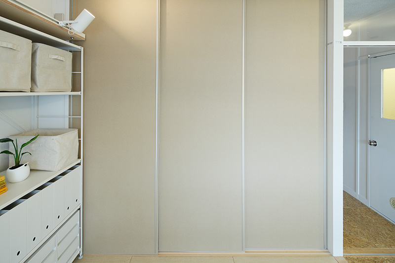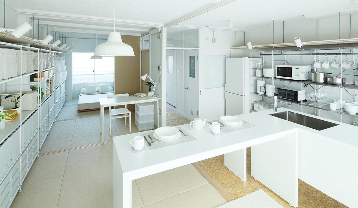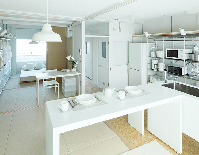 縦につながるLDK 。軽くて持ち運びやすい段ボールふすまを使って、その時の暮らし方に合った間取りに簡単に変えることができます。