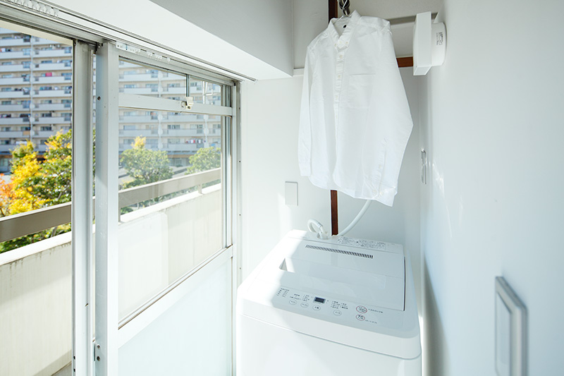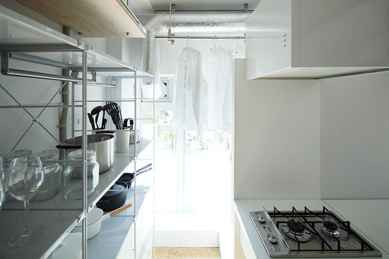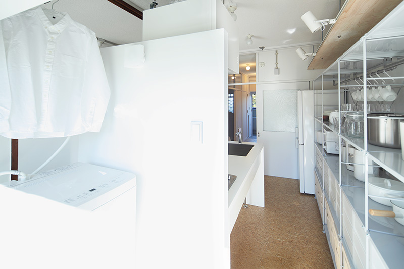 キッチンとひとつづきのユーティリティに洗濯機と物干しを設置。家事動線が短く、料理の待ち時間に洗濯をする、ということも可能です。