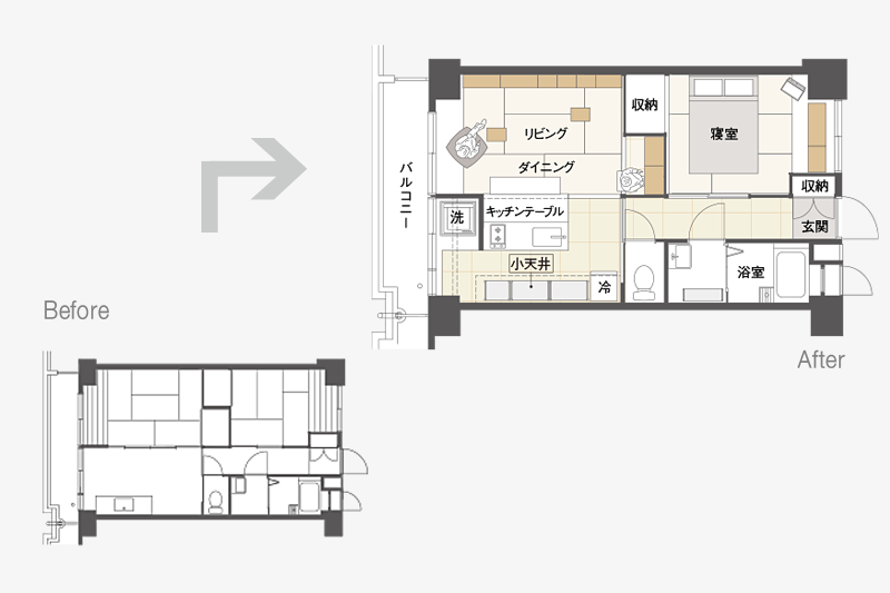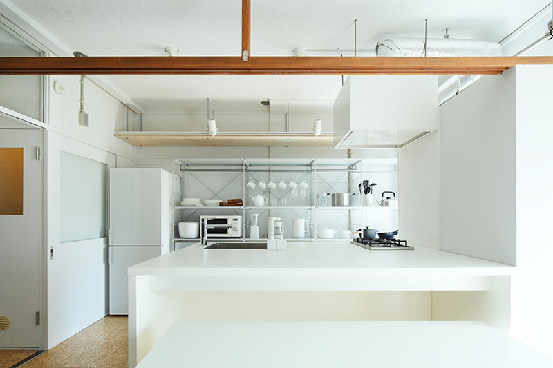 キッチンを壁付けから対面に変え、窓際には室内干しができるユーティリティを設けました。