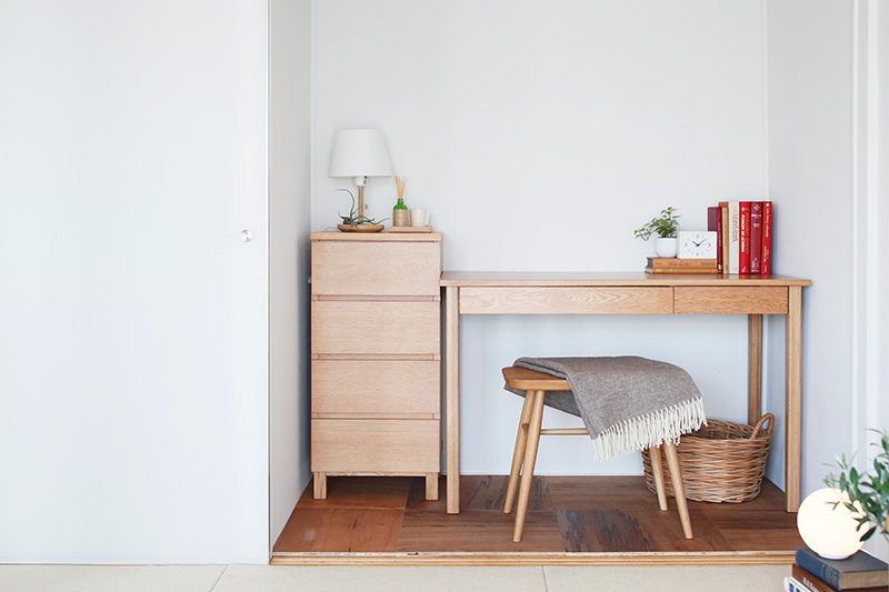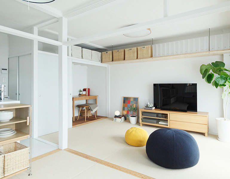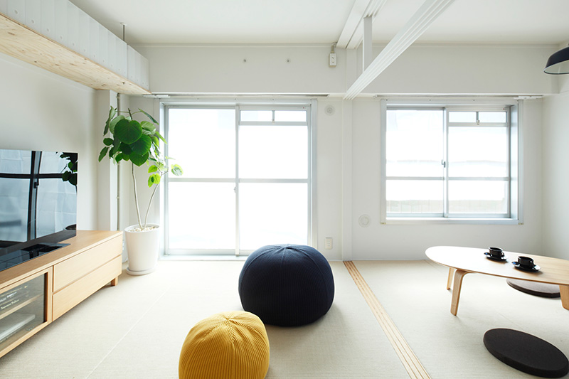部屋のほとんどの部分の床を、やわらかな風合いの麻畳で覆いました。家具を置いて洋室のように使うこともできます。