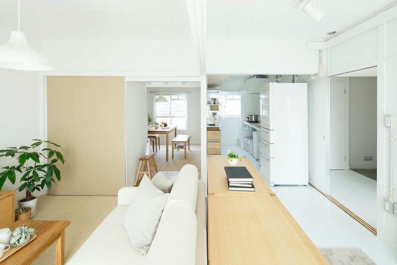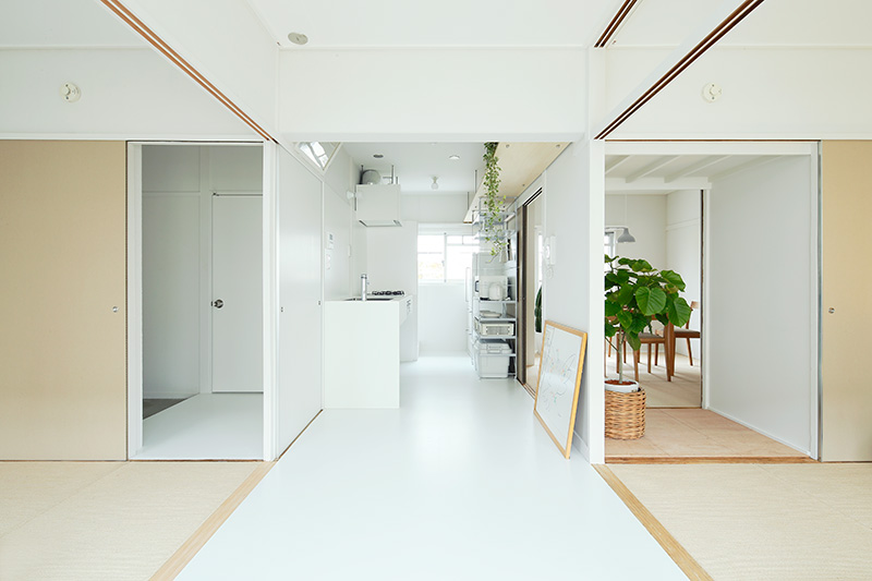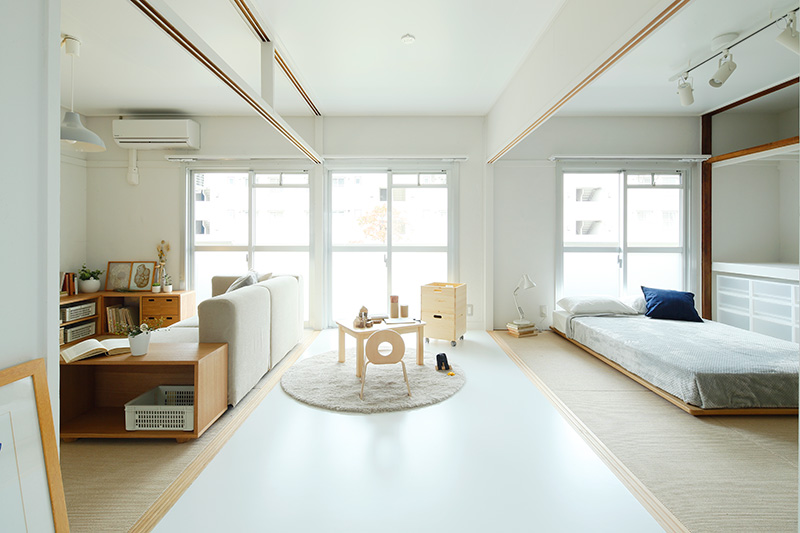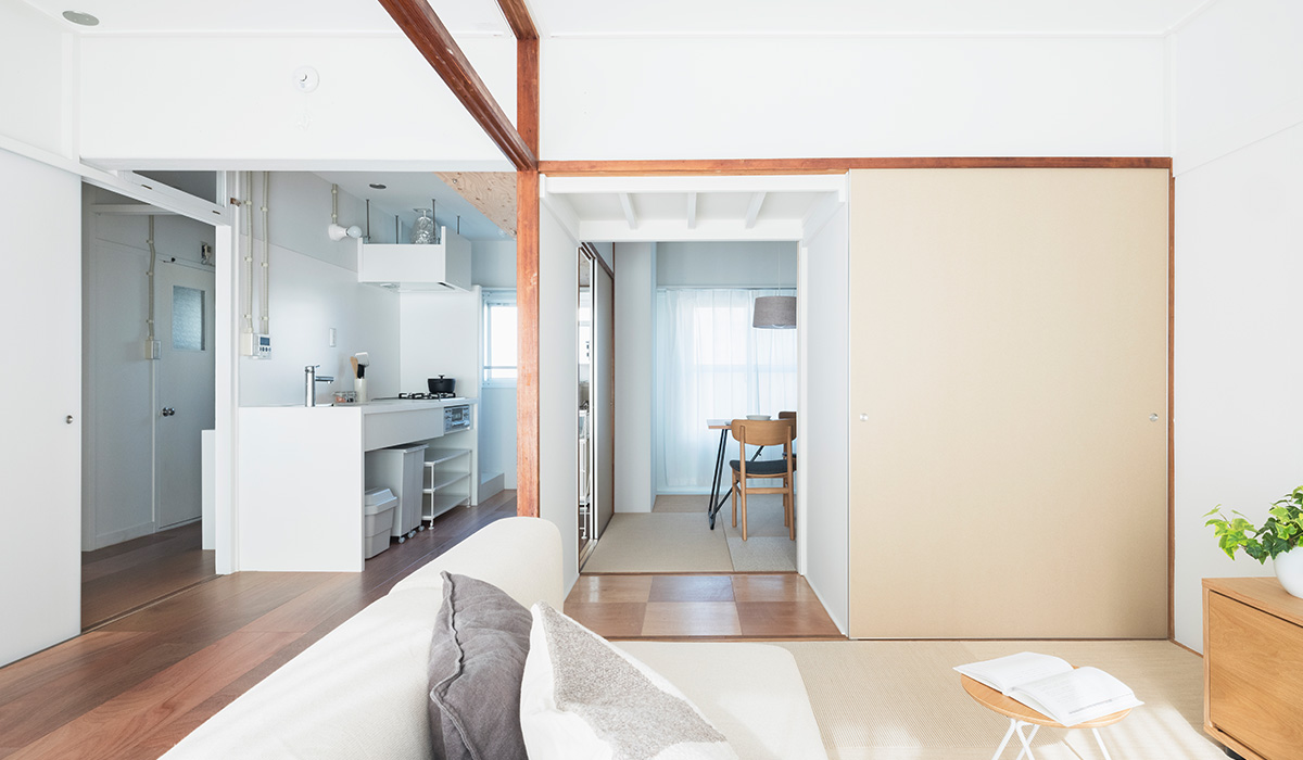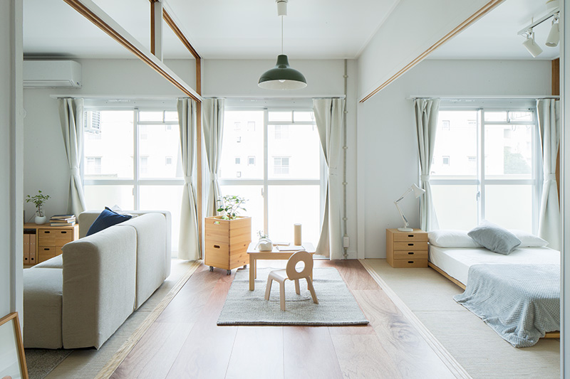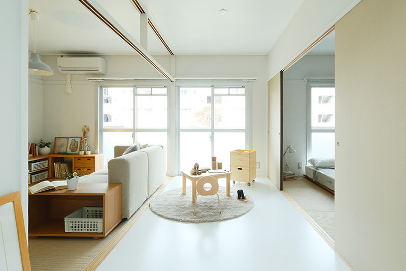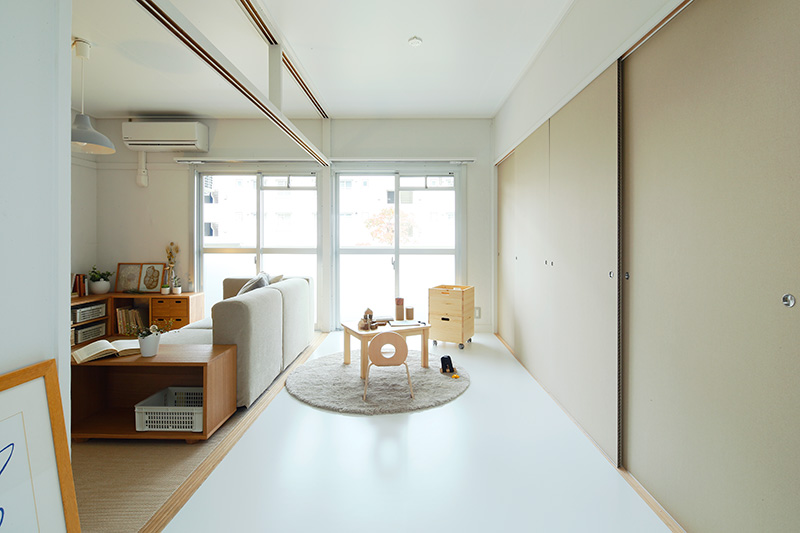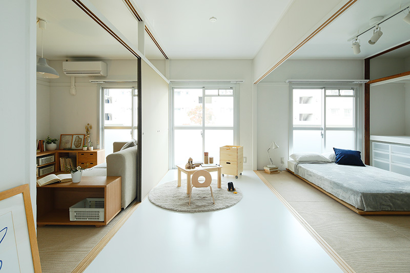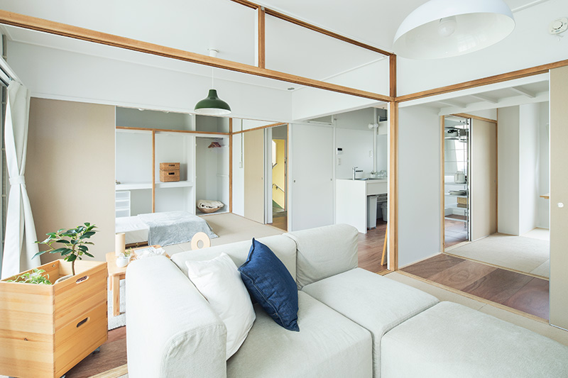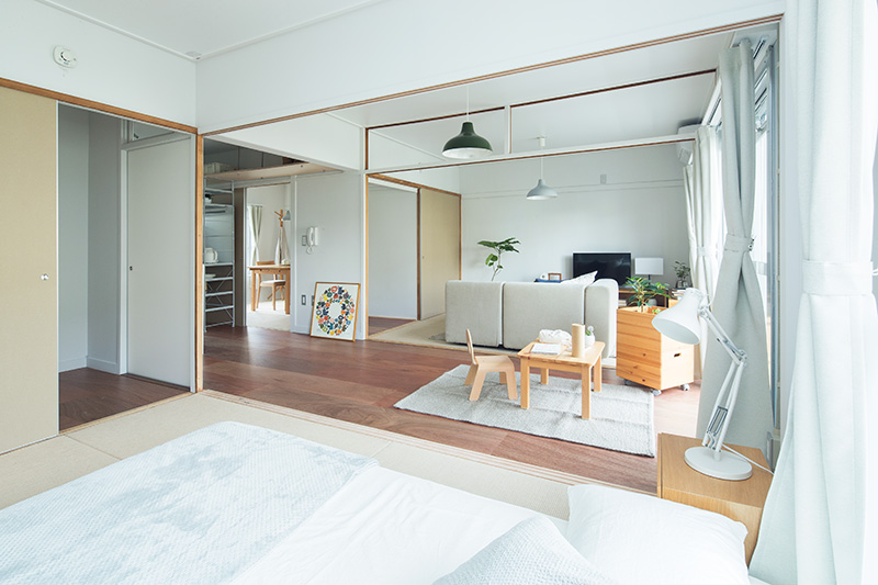 風通しのよい一室空間のLDKのふすまを開け閉めすることで、1LDKから2LDKへと、住む人の家族構成やライフスタイルに合わせながら、自由に間取りを変化させることができます。
