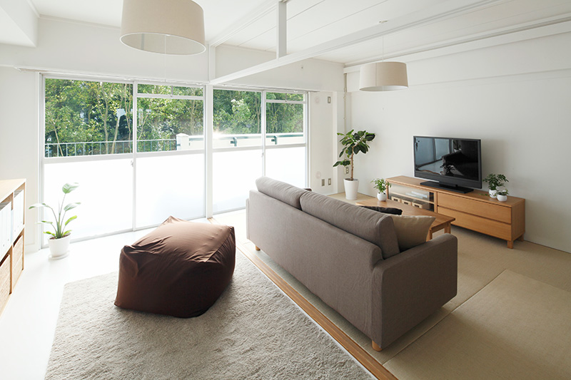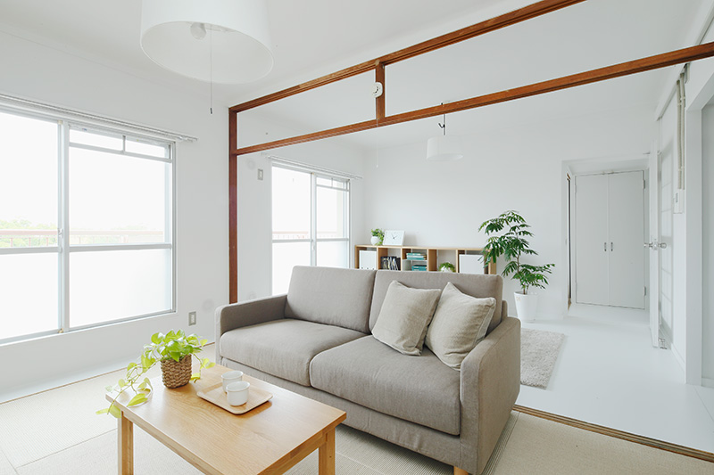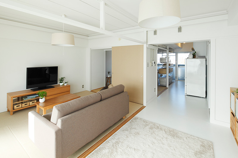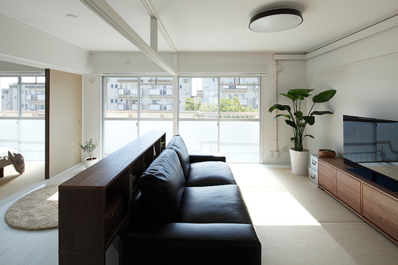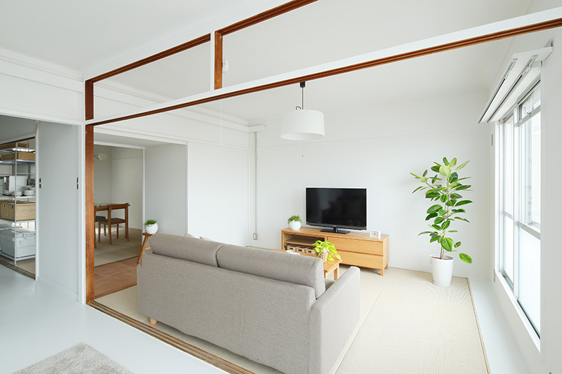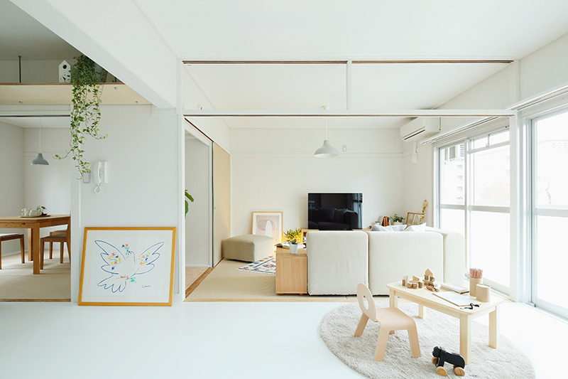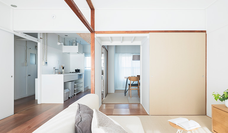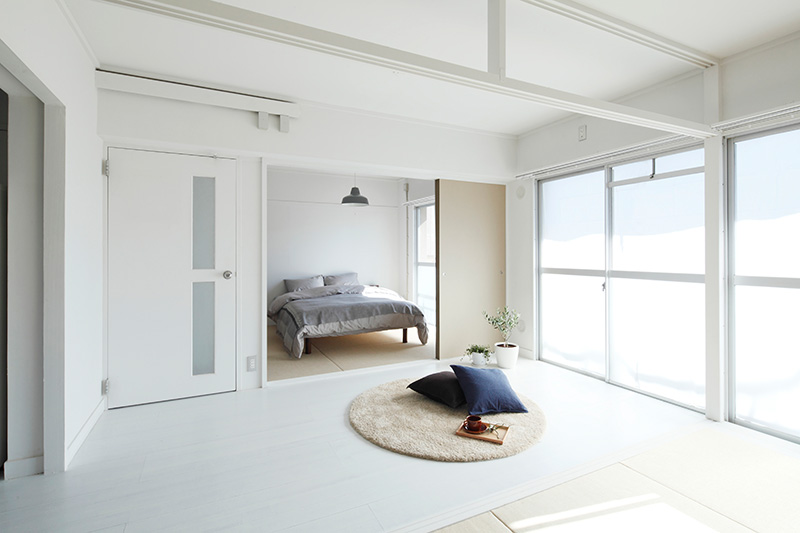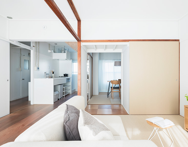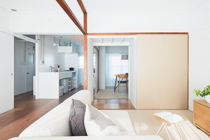 風通しのよい一室空間のLDKのふすまを開け閉めすることで、1LDKから2LDKへと、住む人の家族構成やライフスタイルに合わせながら、自由に間取りを変化させることができます。