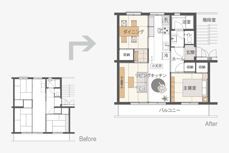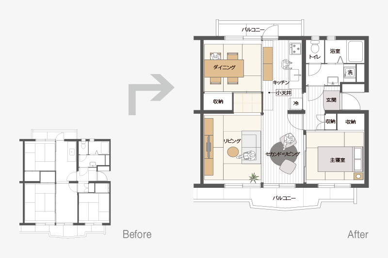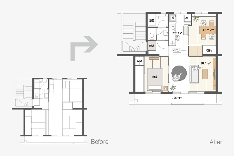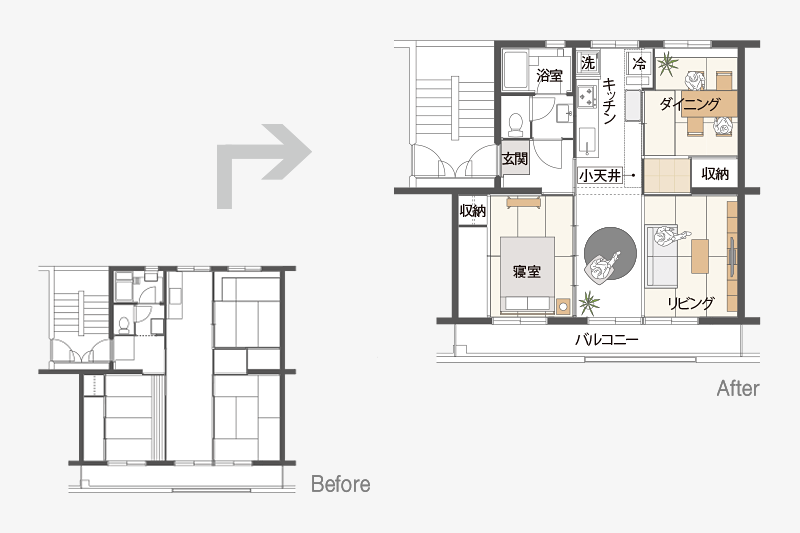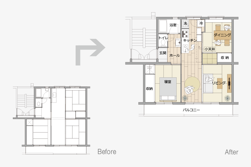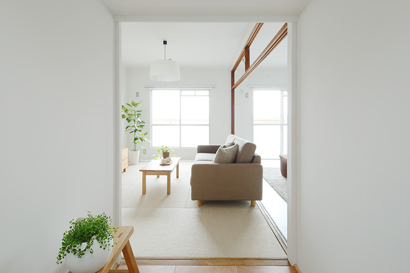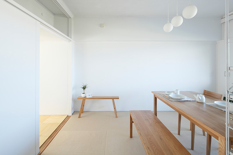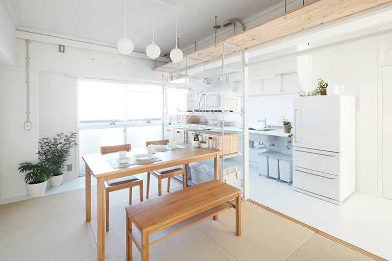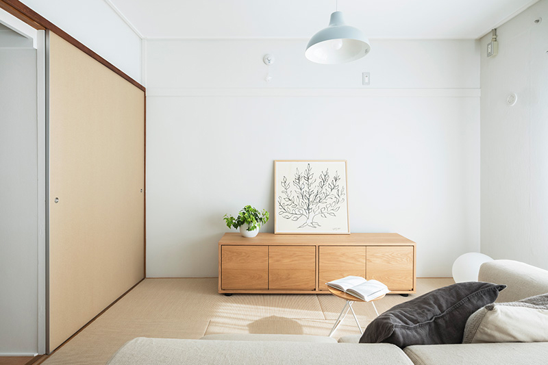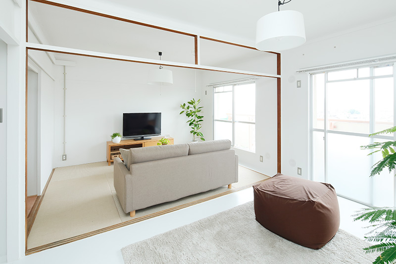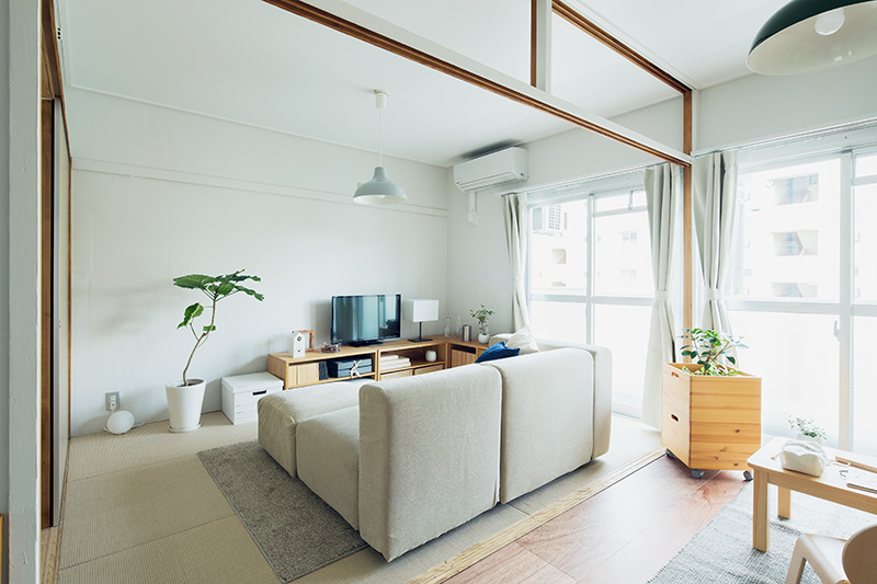 もともとあった押入の一部を撤去して、部屋から部屋へと風がぬけるLDK空間になりました。ふすまを閉じると、1LDKから2LDKに間取りが変化します。