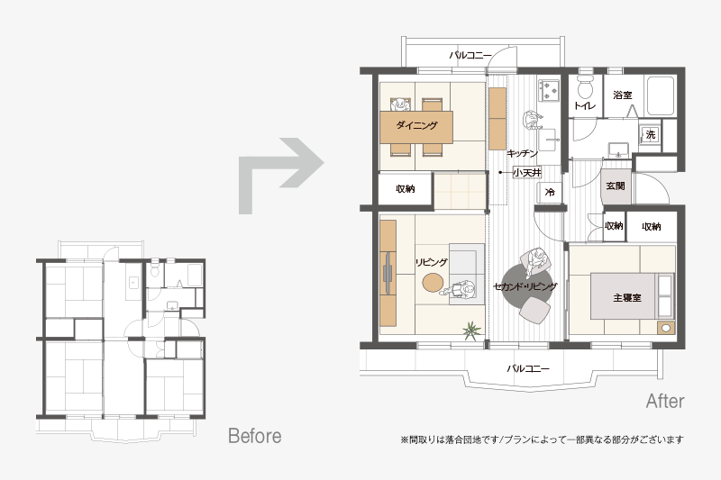 ※新千里北町団地では、寝室の位置を変えることはできますが、ふすまの位置を変えることはできません。