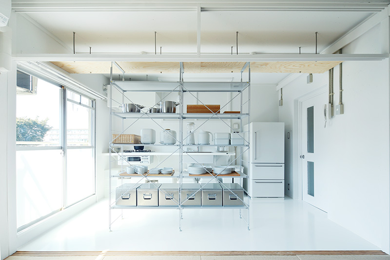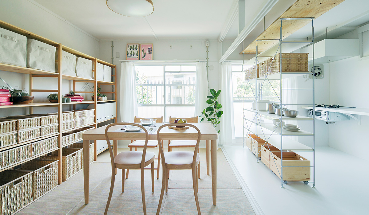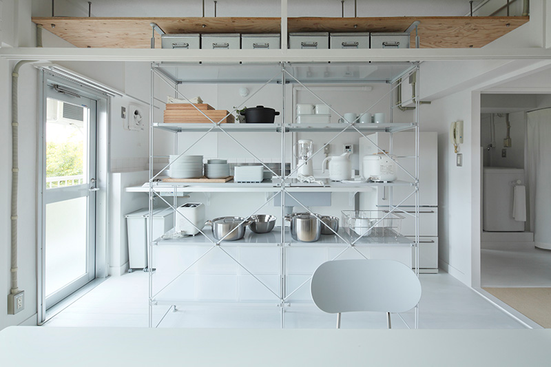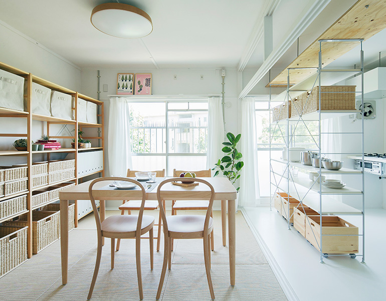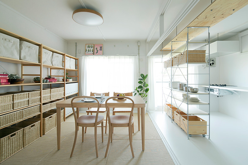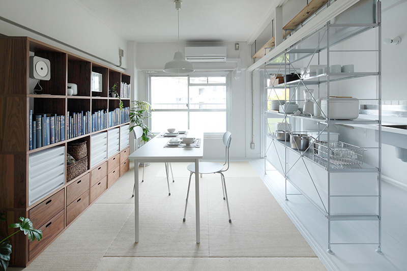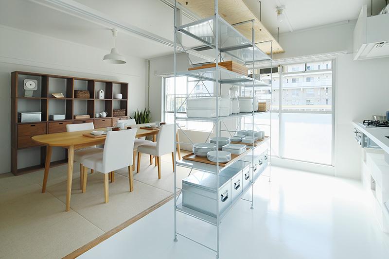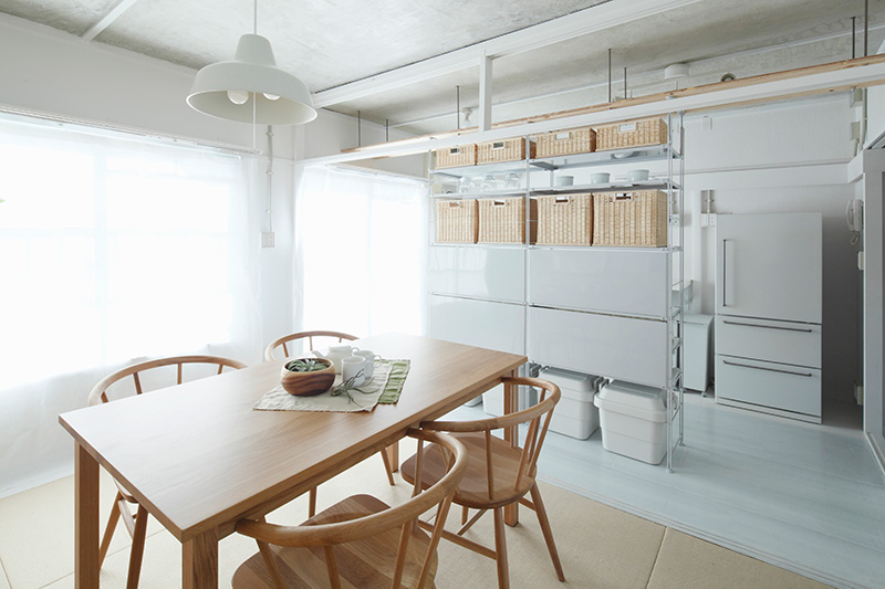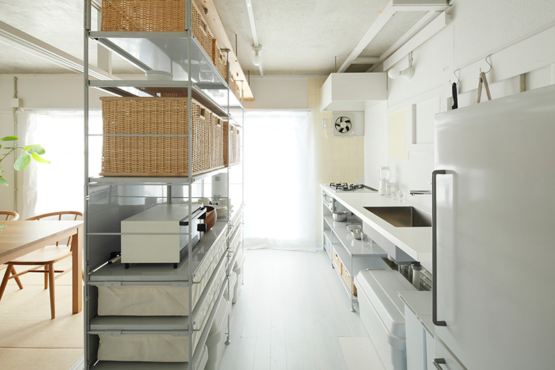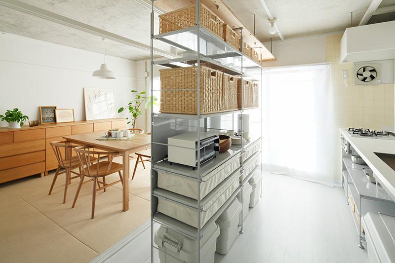 ユニットシェルフを置けばキッチンとダイニングの空間をゆるやかに仕切ることも。