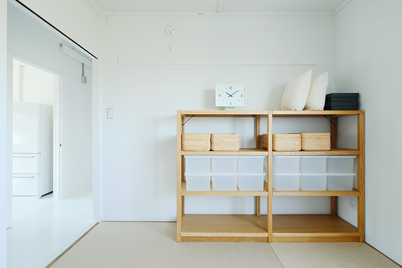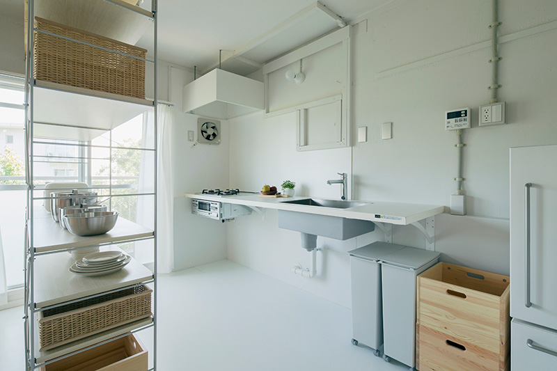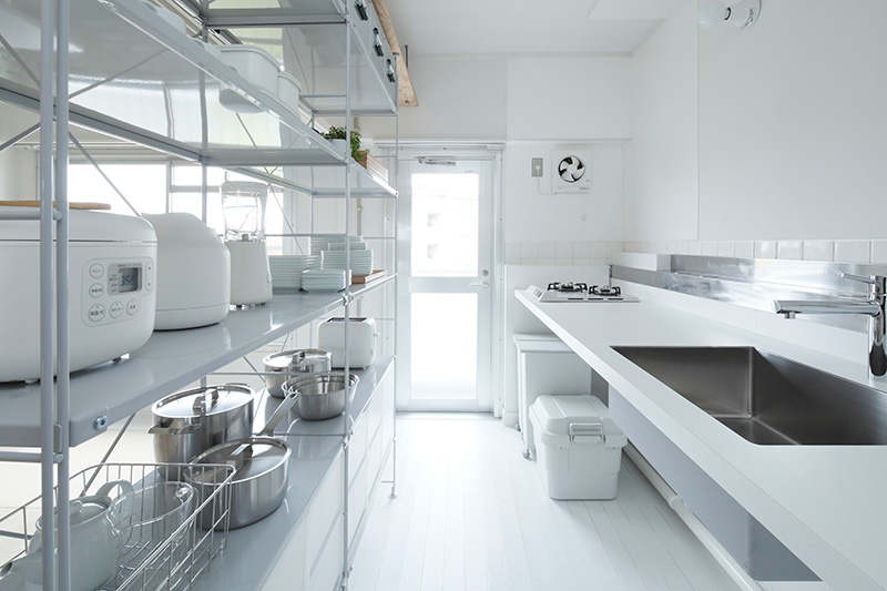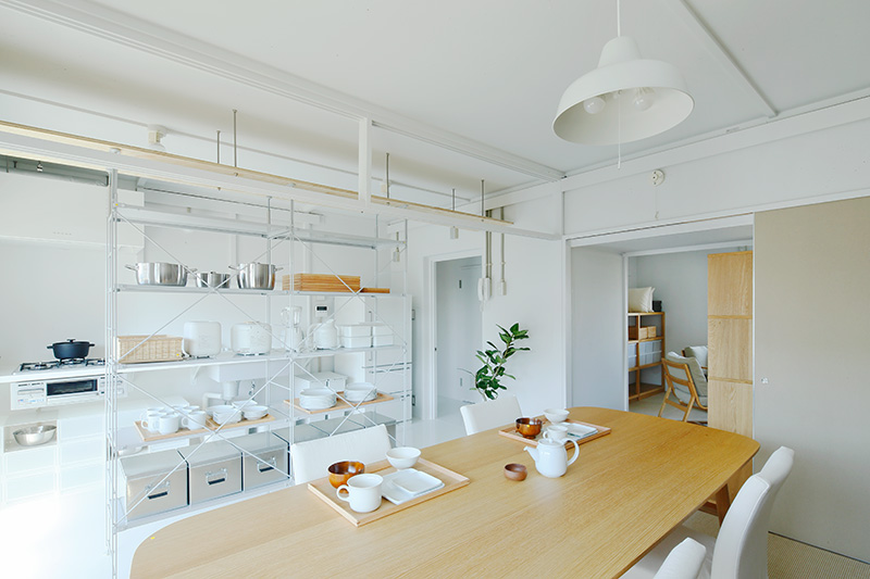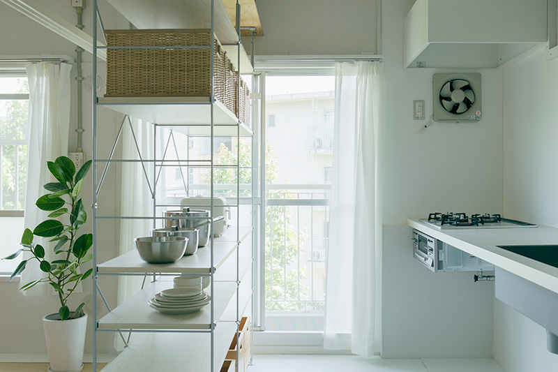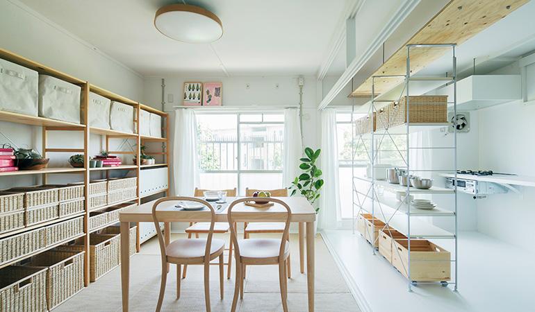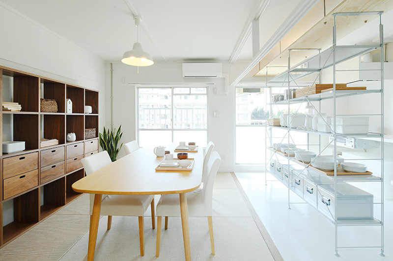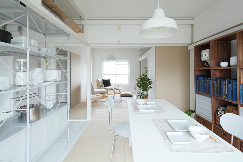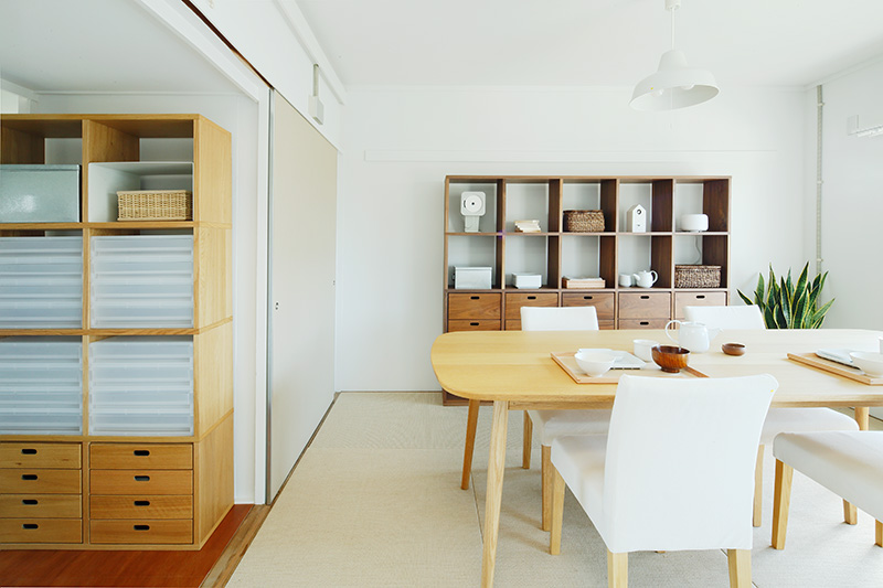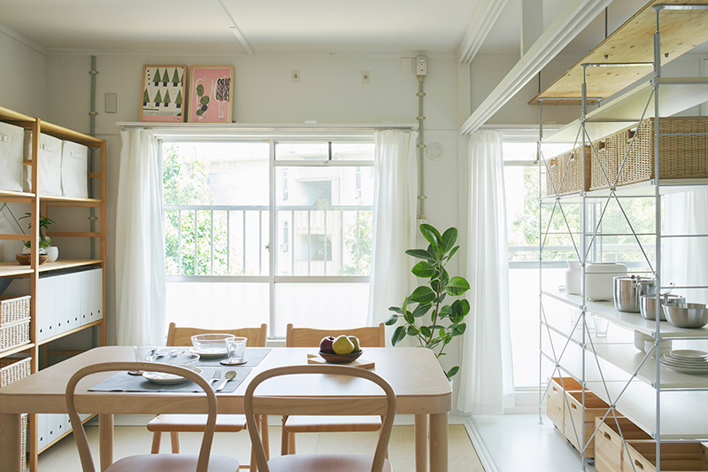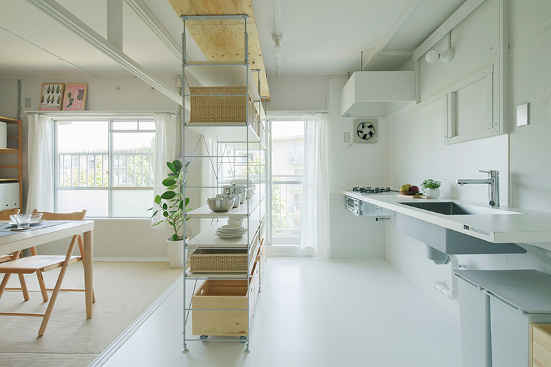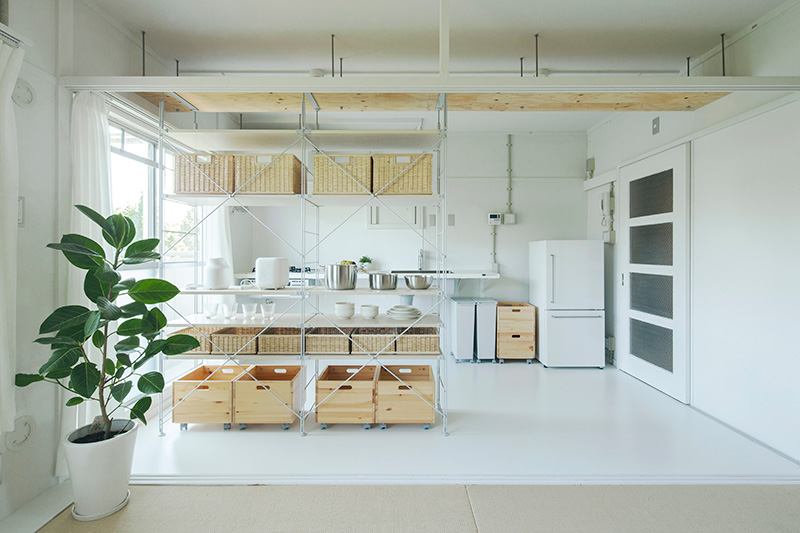 ユニットシェルフを置けばキッチンとダイニングの空間をゆるやかに仕切ることも。