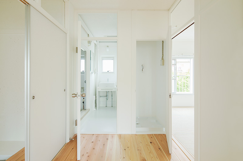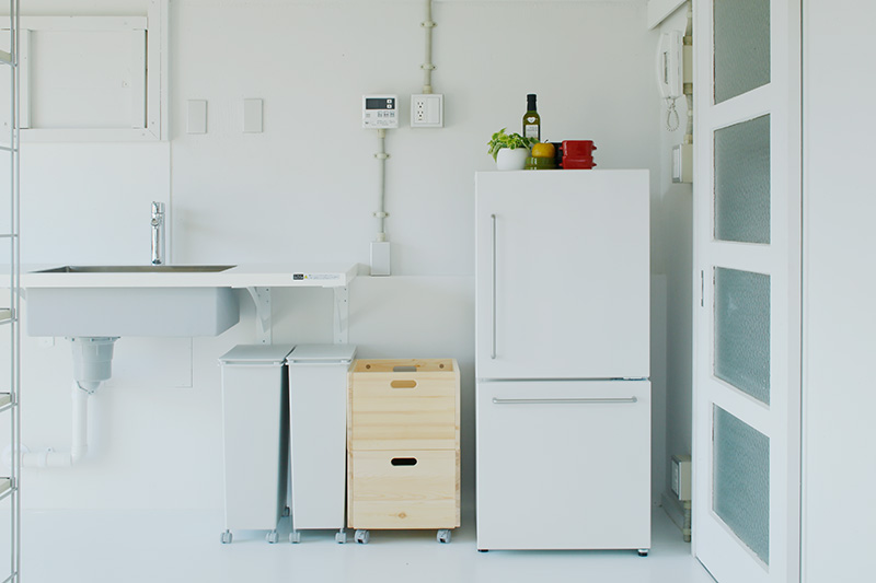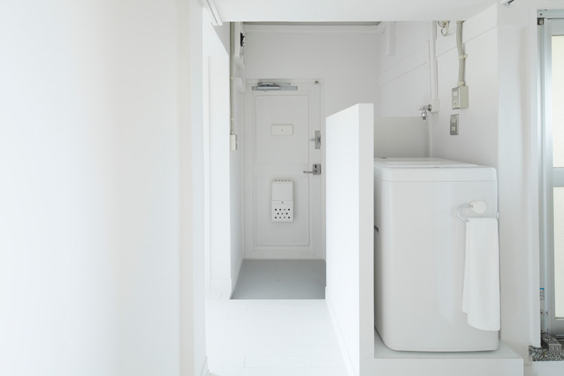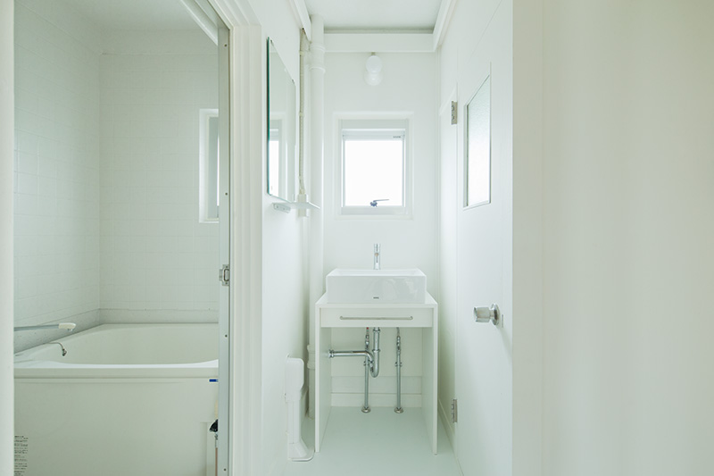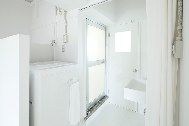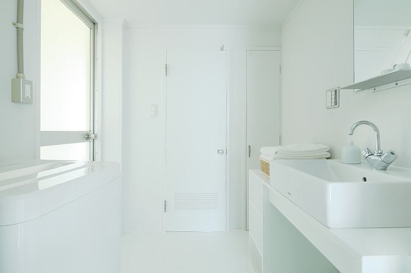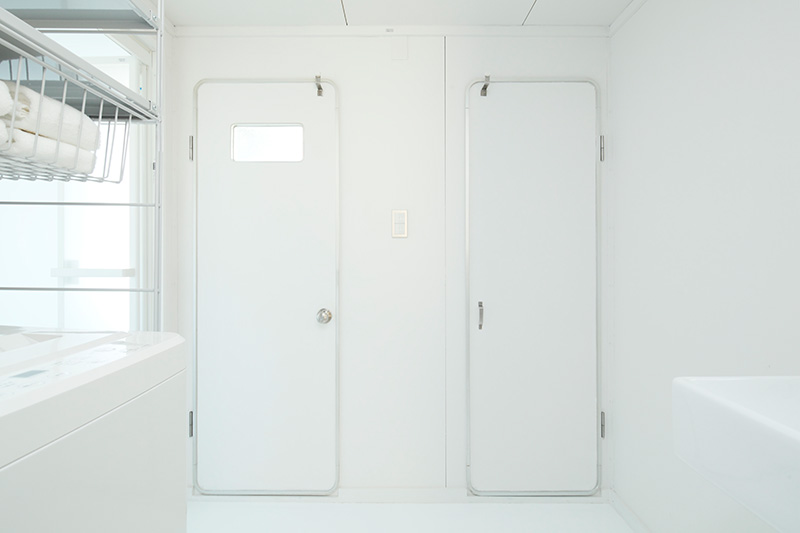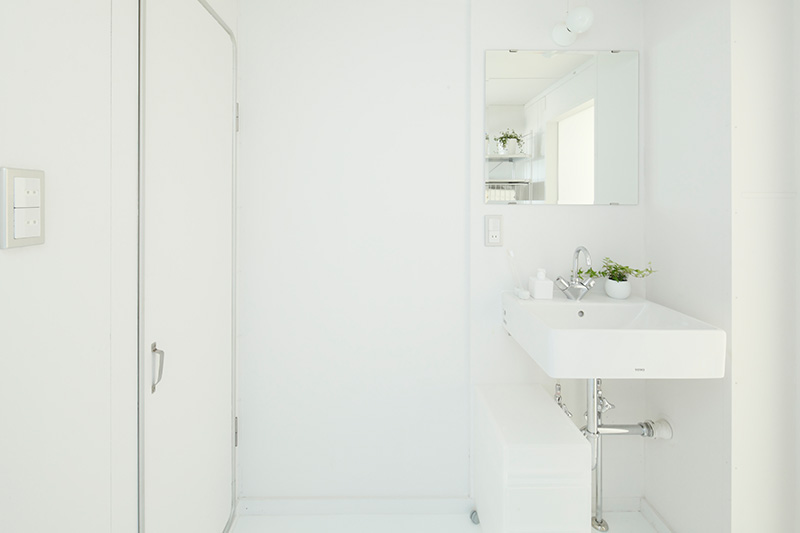 洗面台の隣には収納が。タオルや洗剤などをすっきりと収められます。