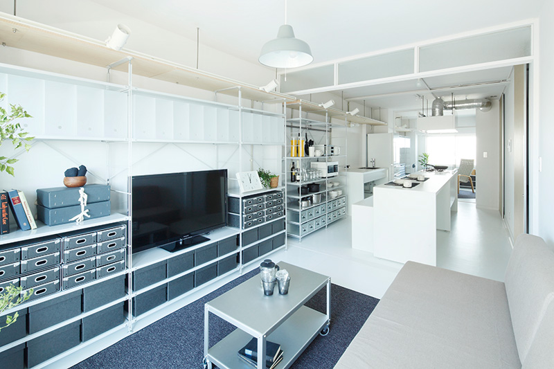 家族が別々のことをしていてもどこかに気配を感じていられるひとつながりの居室空間。片側の壁に小天井を設置しており、その下を収納スペースとして活用できます。