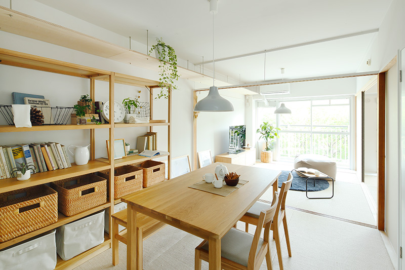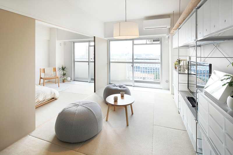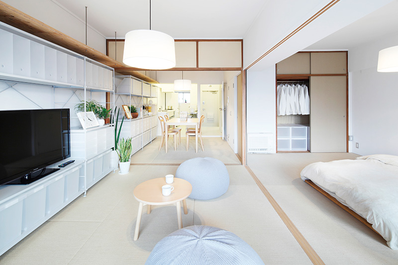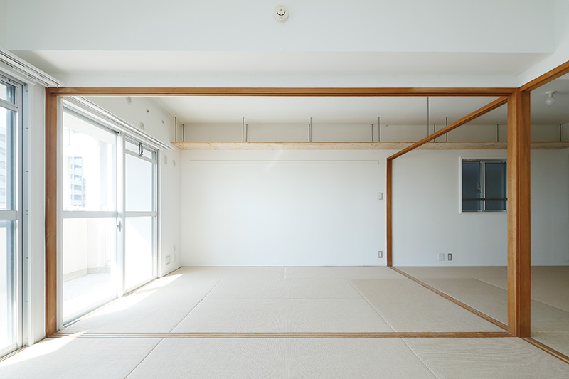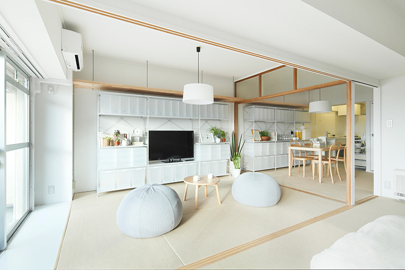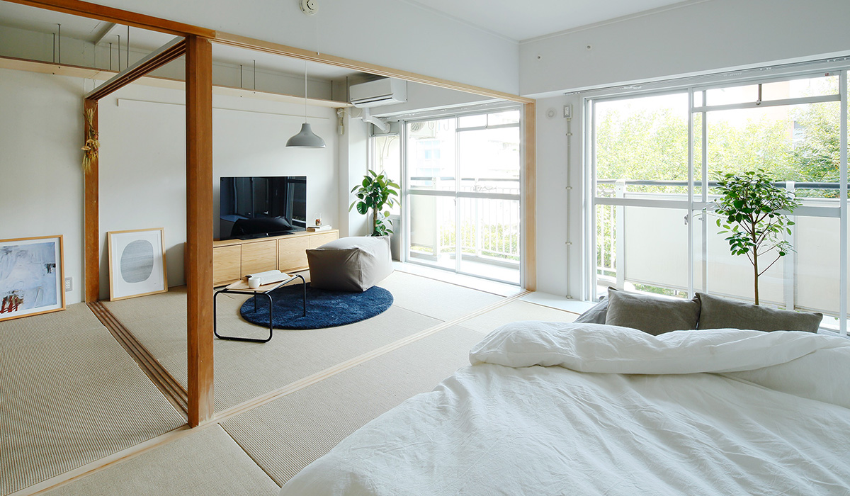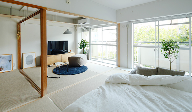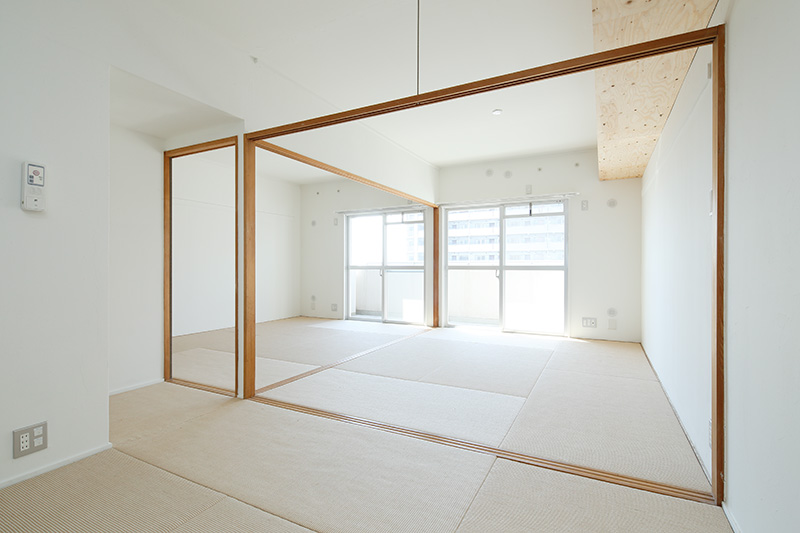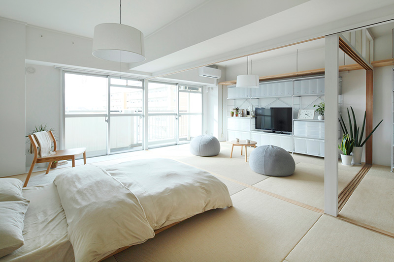 麻畳でつながった開放的なリビング、ダイニングと寝室。壁のない大開口でたっぷりと光を取り込みます。