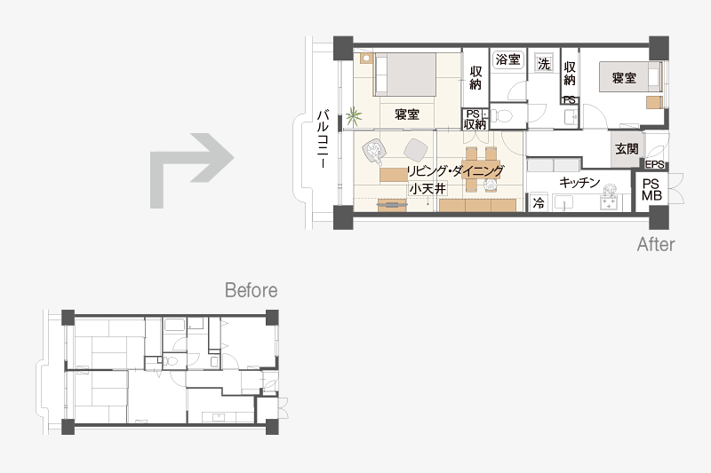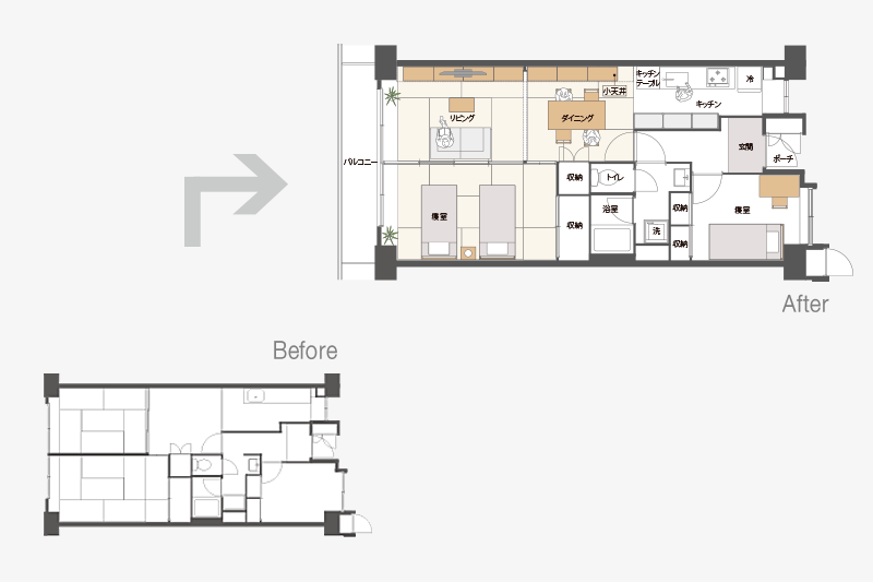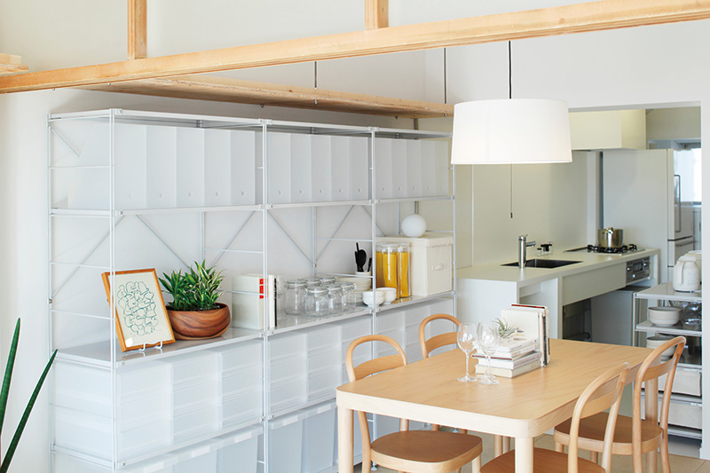 リビングからキッチンまで長く広がる一室に。それぞれの役割を保ちつつ、 ひとつにつながります。