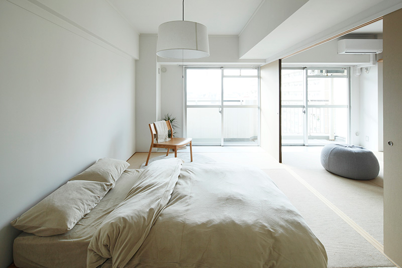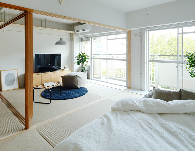 麻畳でつながった開放的なリビング、 ダイニングと寝室。壁のない大開口でたっぷりと光を取り込みます。