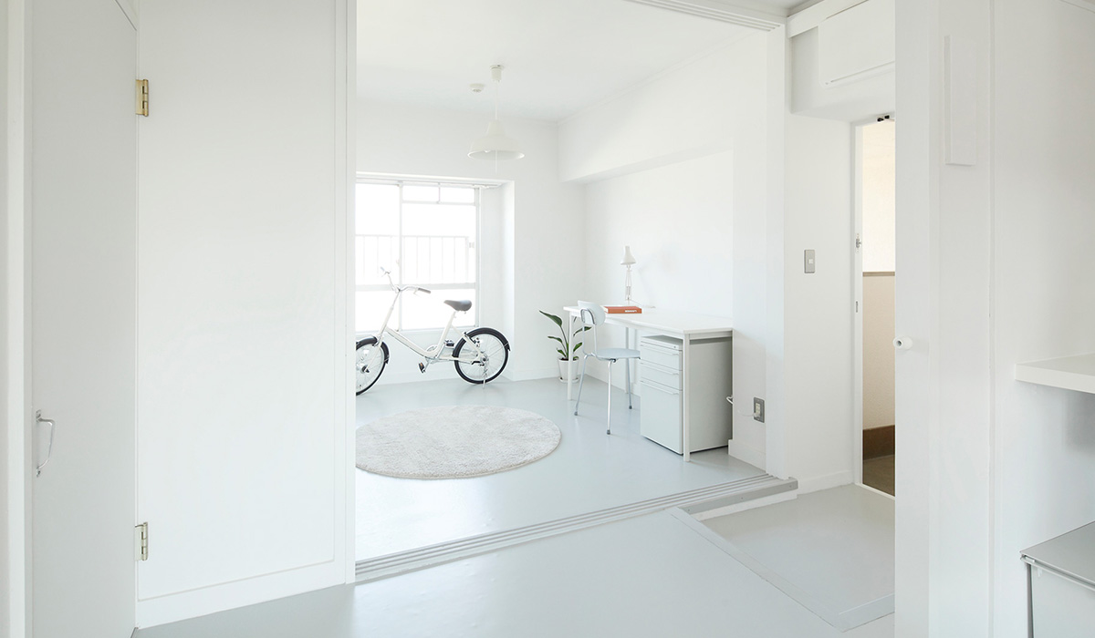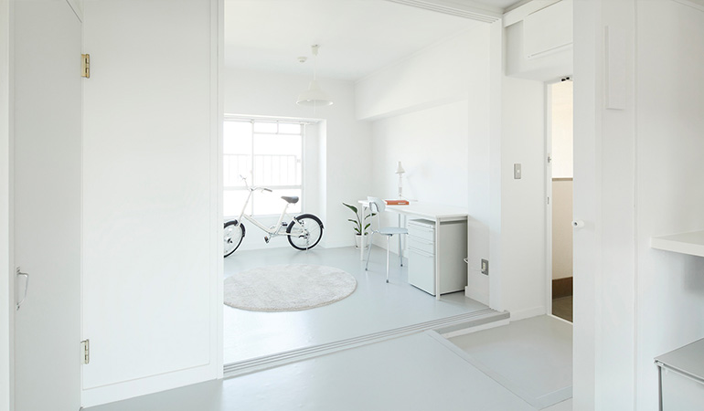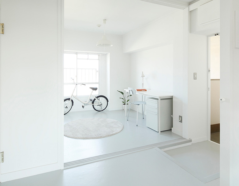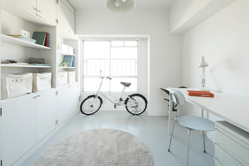 ワークスペースは土間風の床。自転車やアウトドア用品などを置けます。