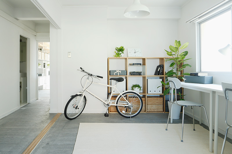 玄関から土間でつながるワークスペース。コンクリートでできているので自転車やアウトドア用品をストックするのにも適しています。