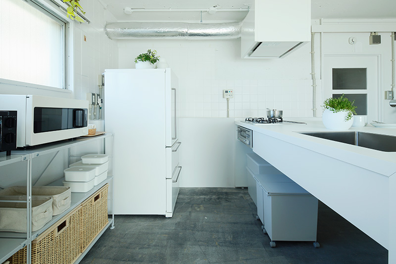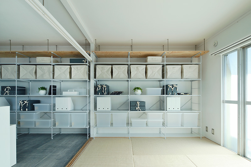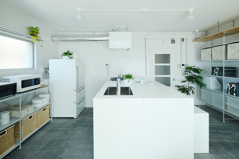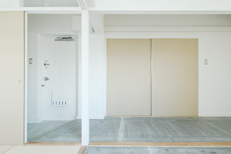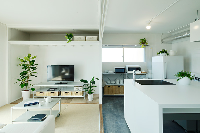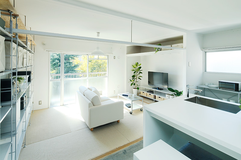 土間は玄関から、ワークスペース、キッチンへとつながります。一番奥のリビングスペースは麻畳。
