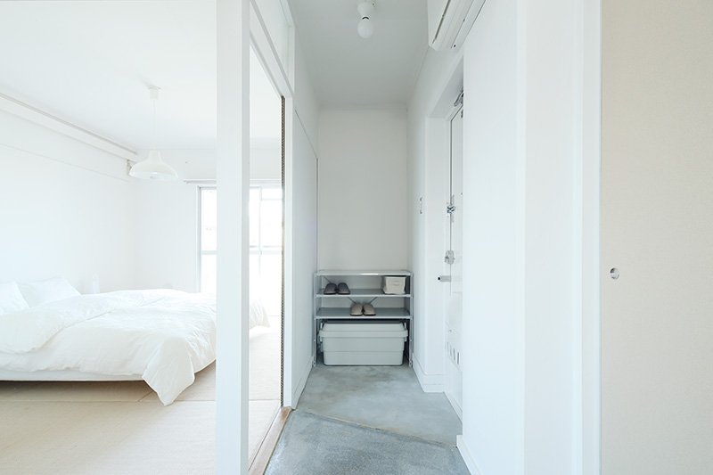 玄関から廊下へとつながる土間空間。その先には土間でつながるワークスペースを設けました。