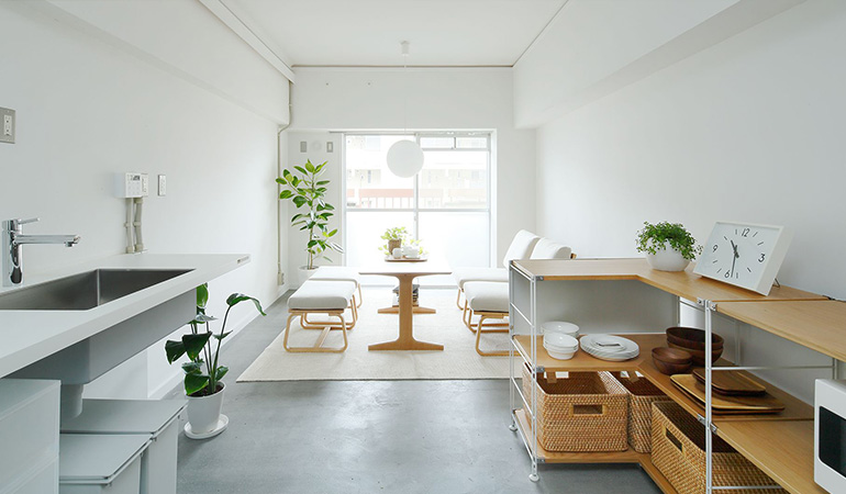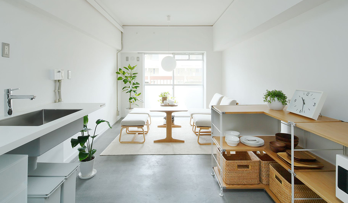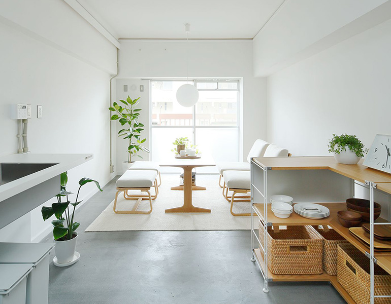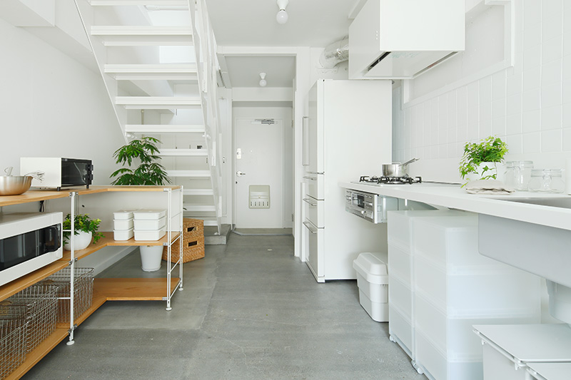 玄関を開けると階段越しにダイングキッチンが広がります。