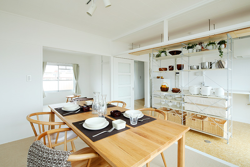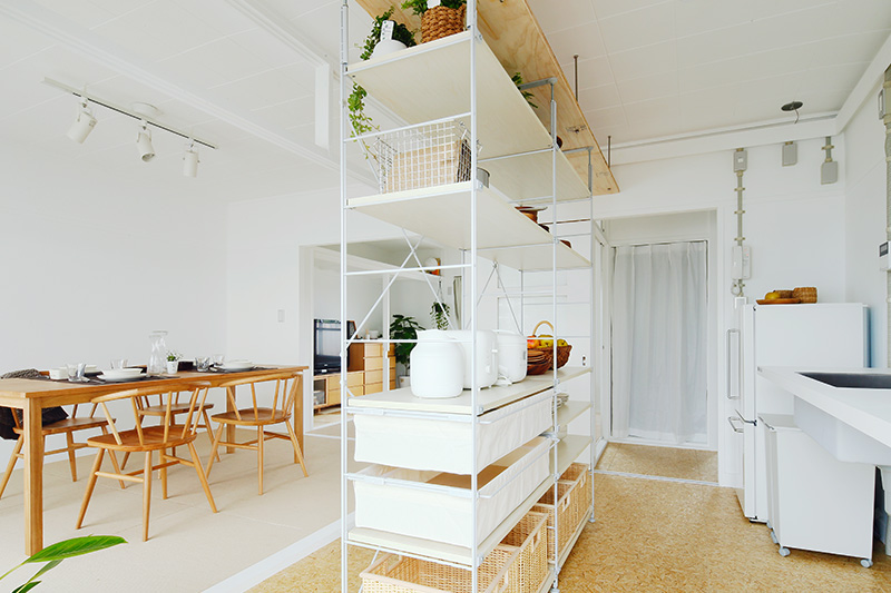 ダイニングとキッチンの間に食器棚を設置することで、ゆるやかに空間を仕切ることもできます。