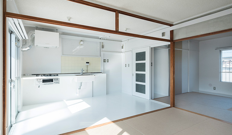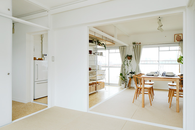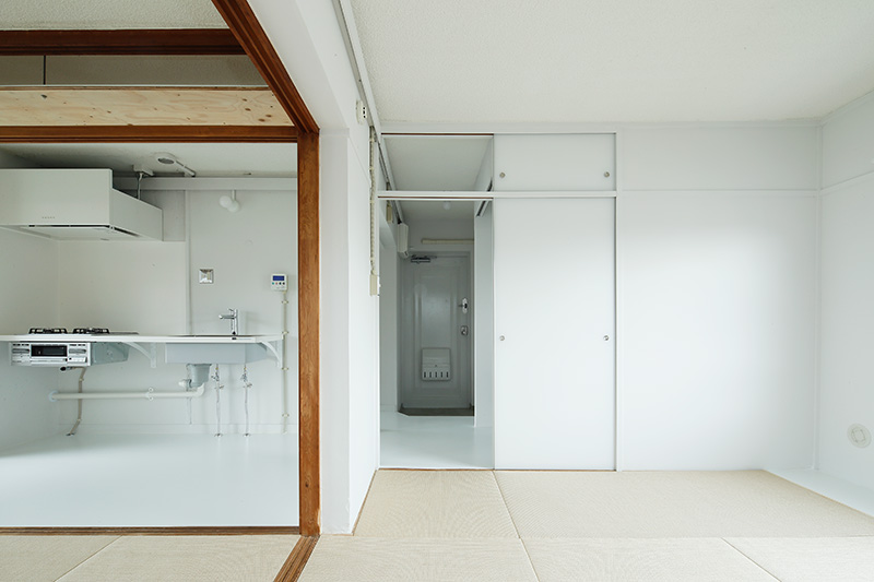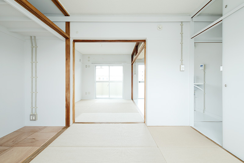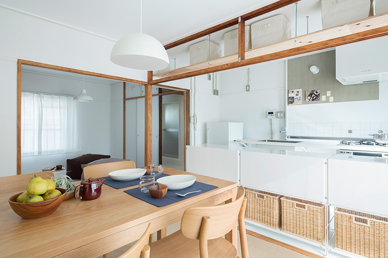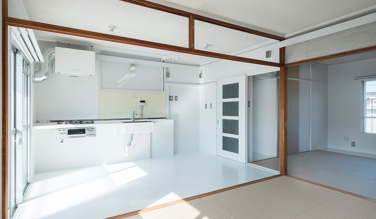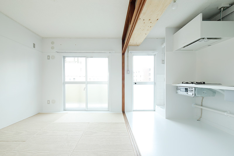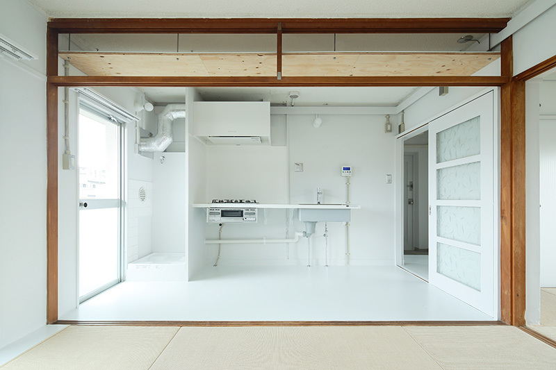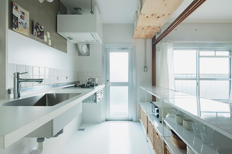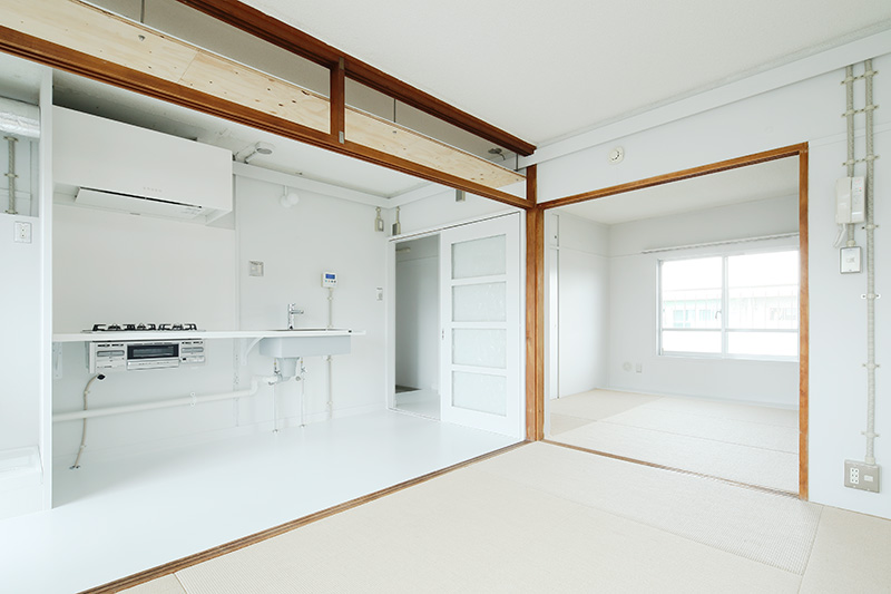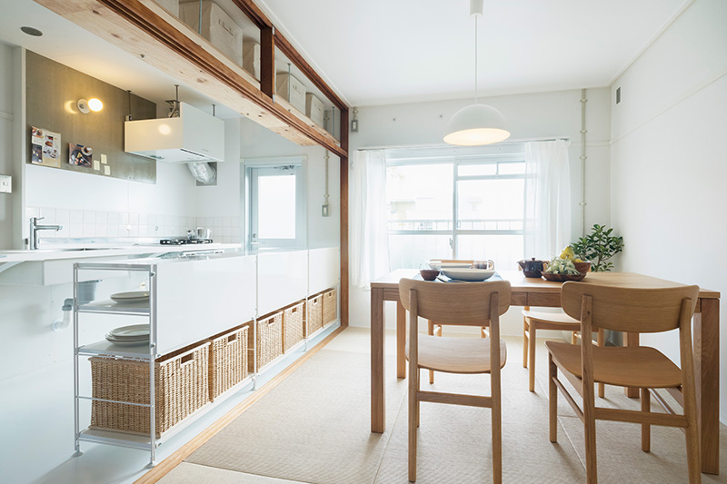 壁付けにキッチンを新設することでバルコニー面の広さを確保しました。また南北を隔てる壁や押入の中棚を撤去して部屋の一部として解放し、南北につながる広々としたLDK空間としました。