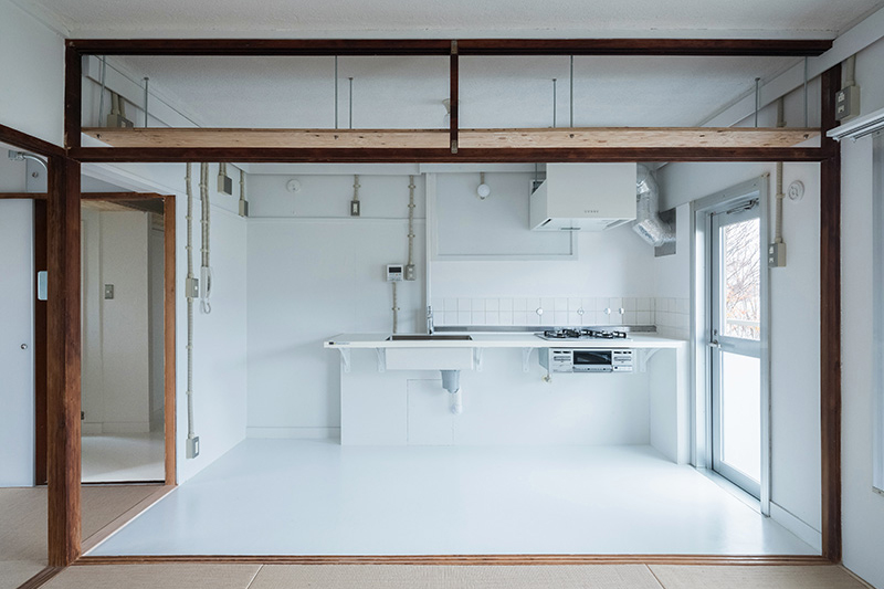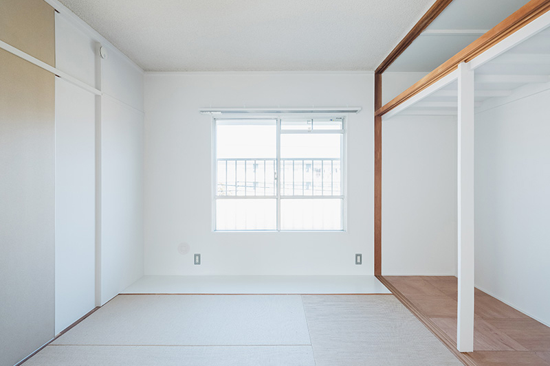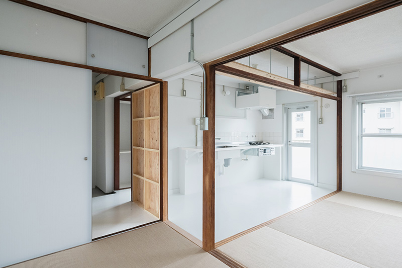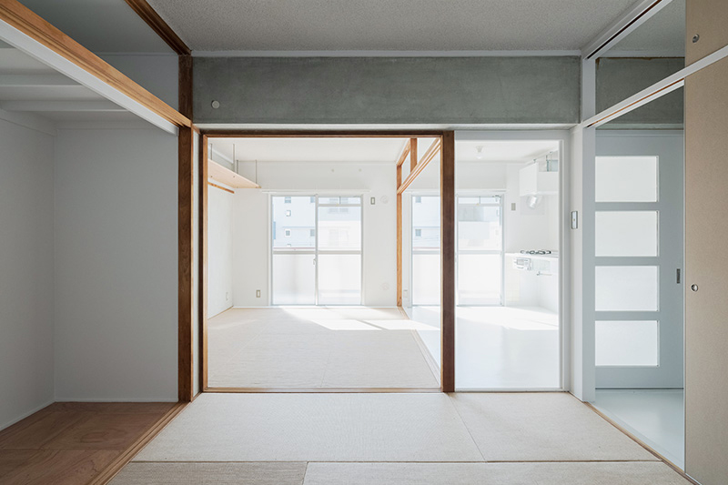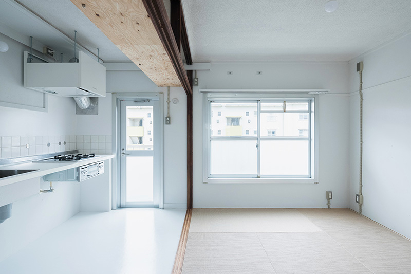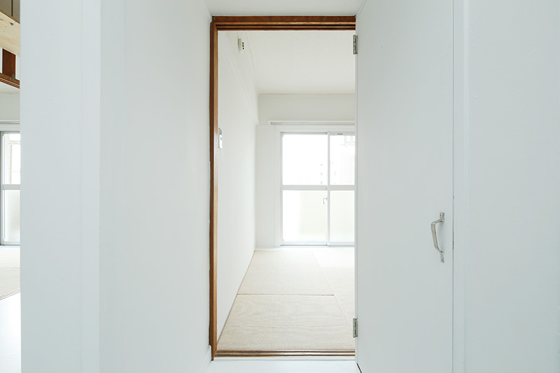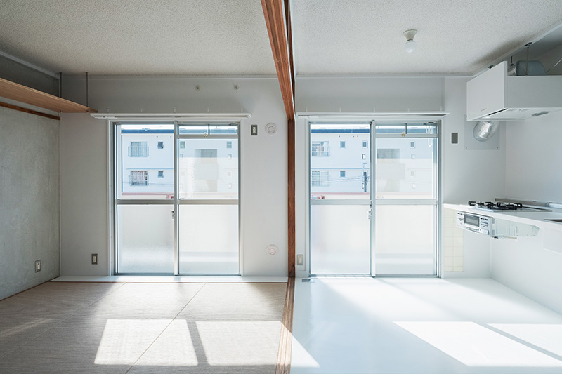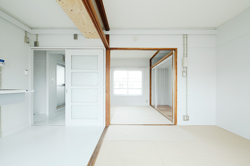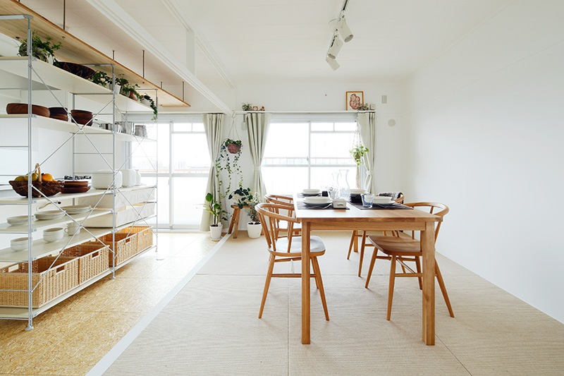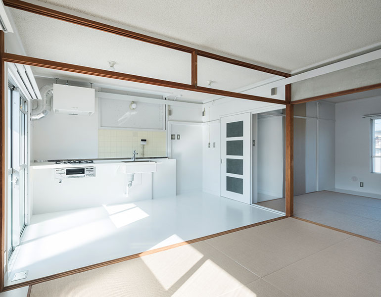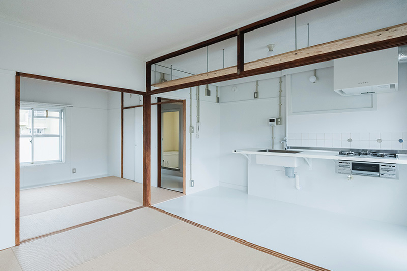 壁付けにキッチンを新設することでバルコニー面の広さを確保しました。また南北を隔てる壁や押入の中棚を撤去して部屋の一部として解放し、南北につながる広々としたLDK空間としました。